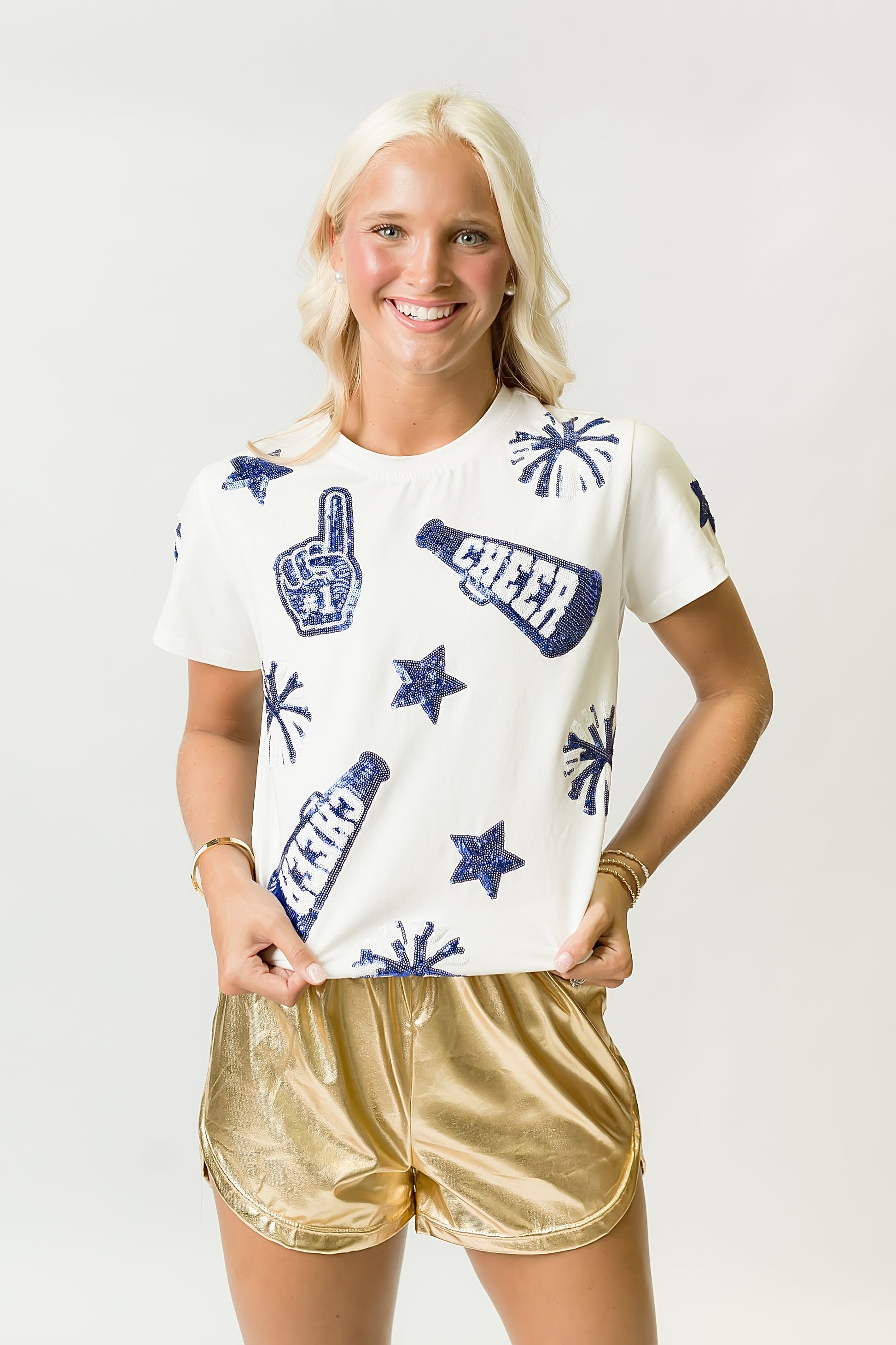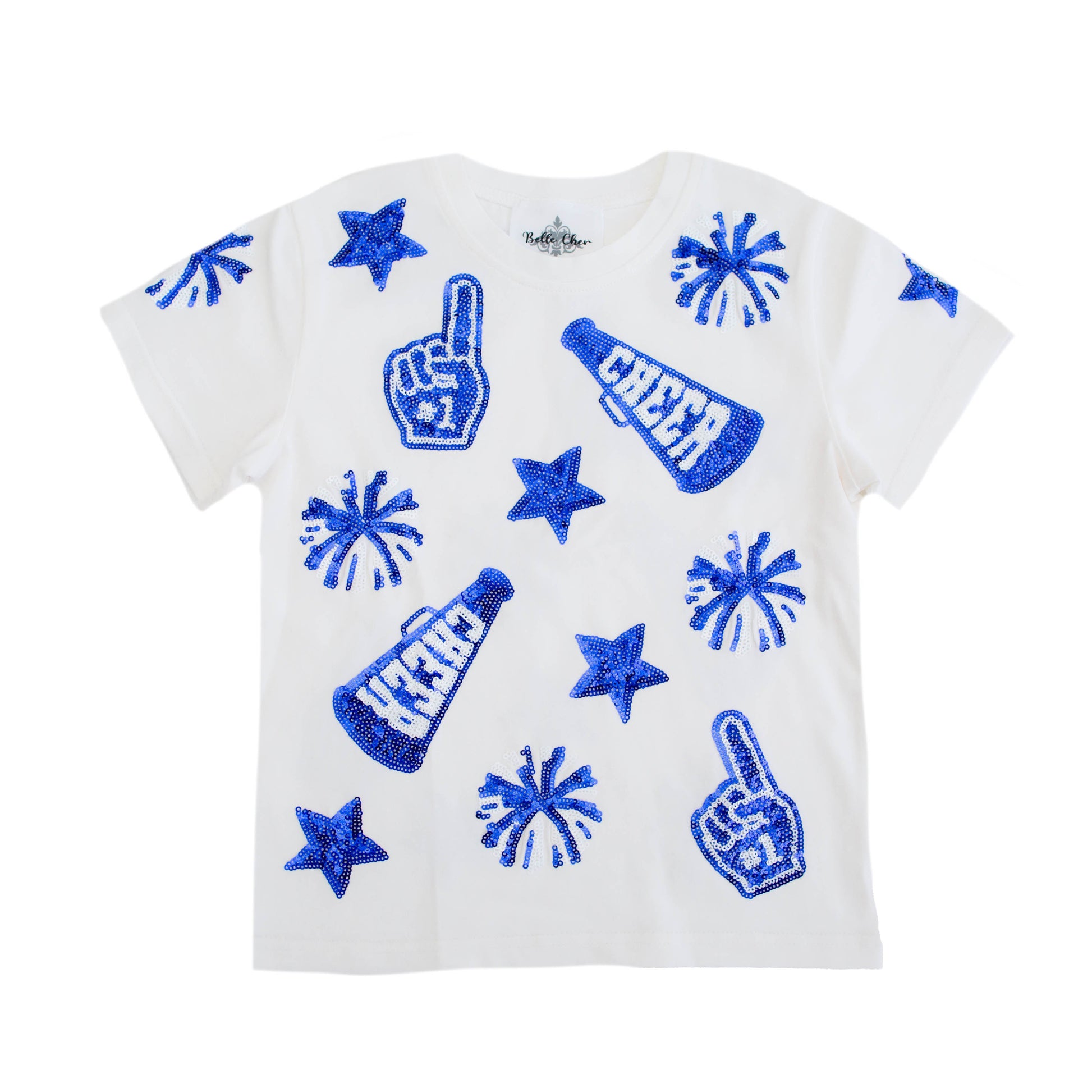 Show your team spirit in style with this Royal Blue and White Cheer Shirt! Its vibrant colors and comfortable fit make it perfect for cheering on your favorite squad or adding a pop of fun to your casual wardrobe. Whether you're at the game or hanging out with friends, this shirt brings energy and excitement to every moment.