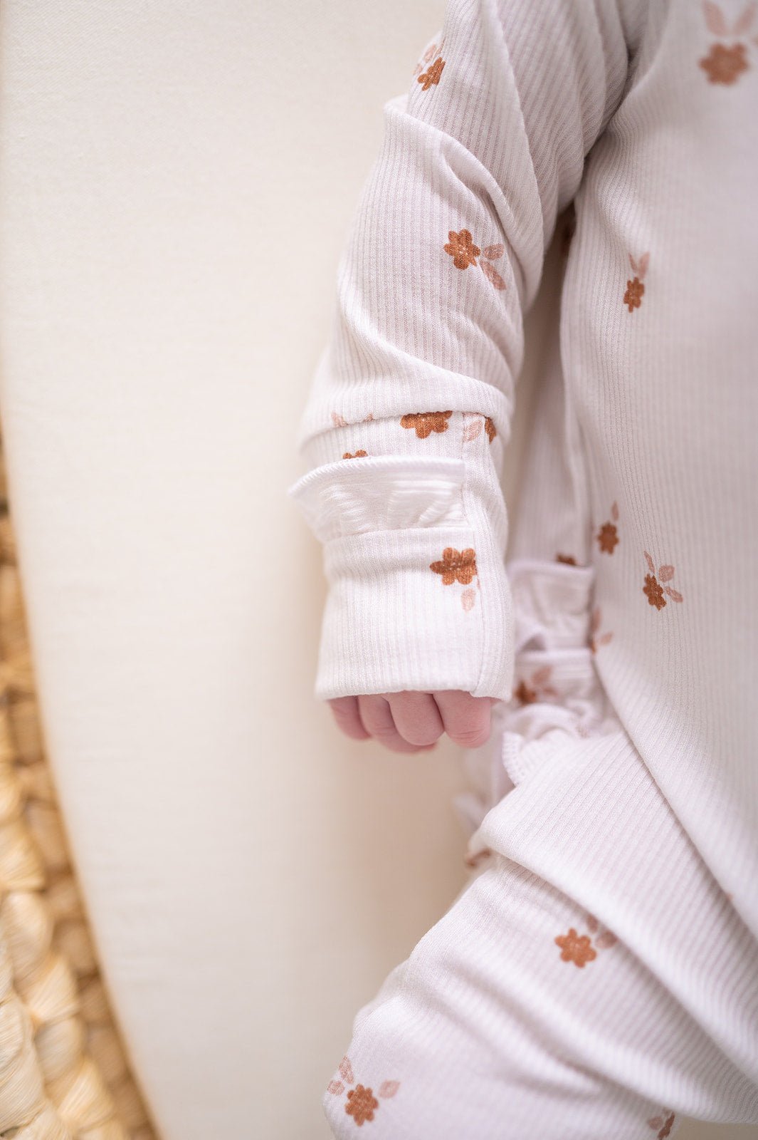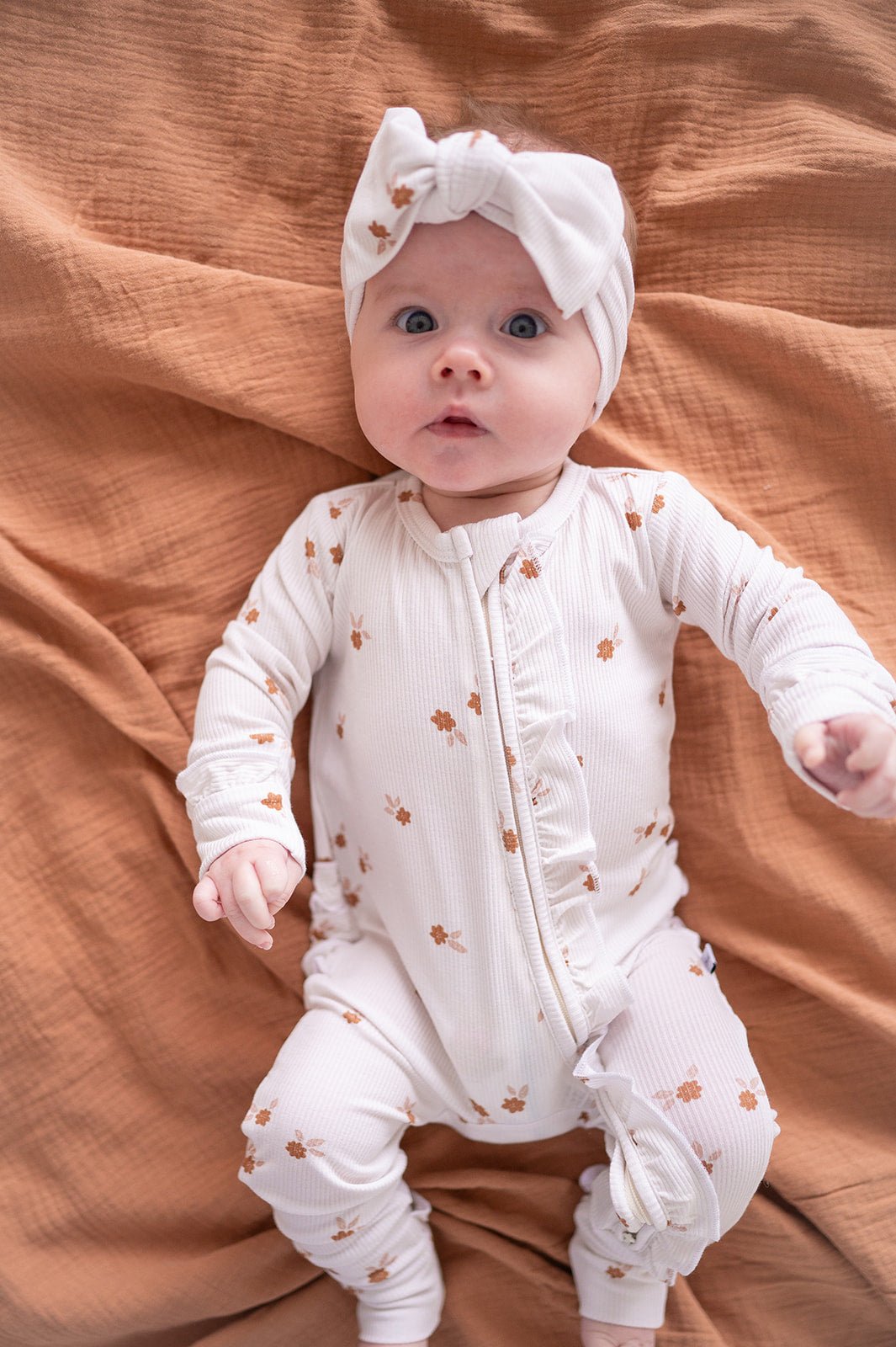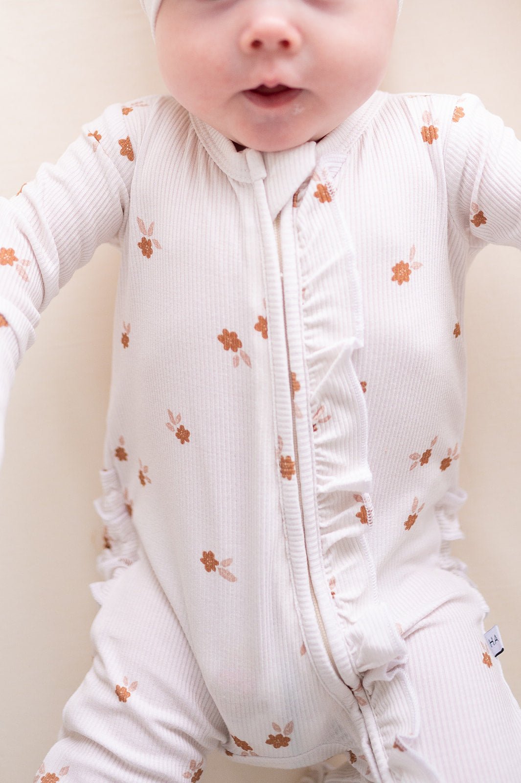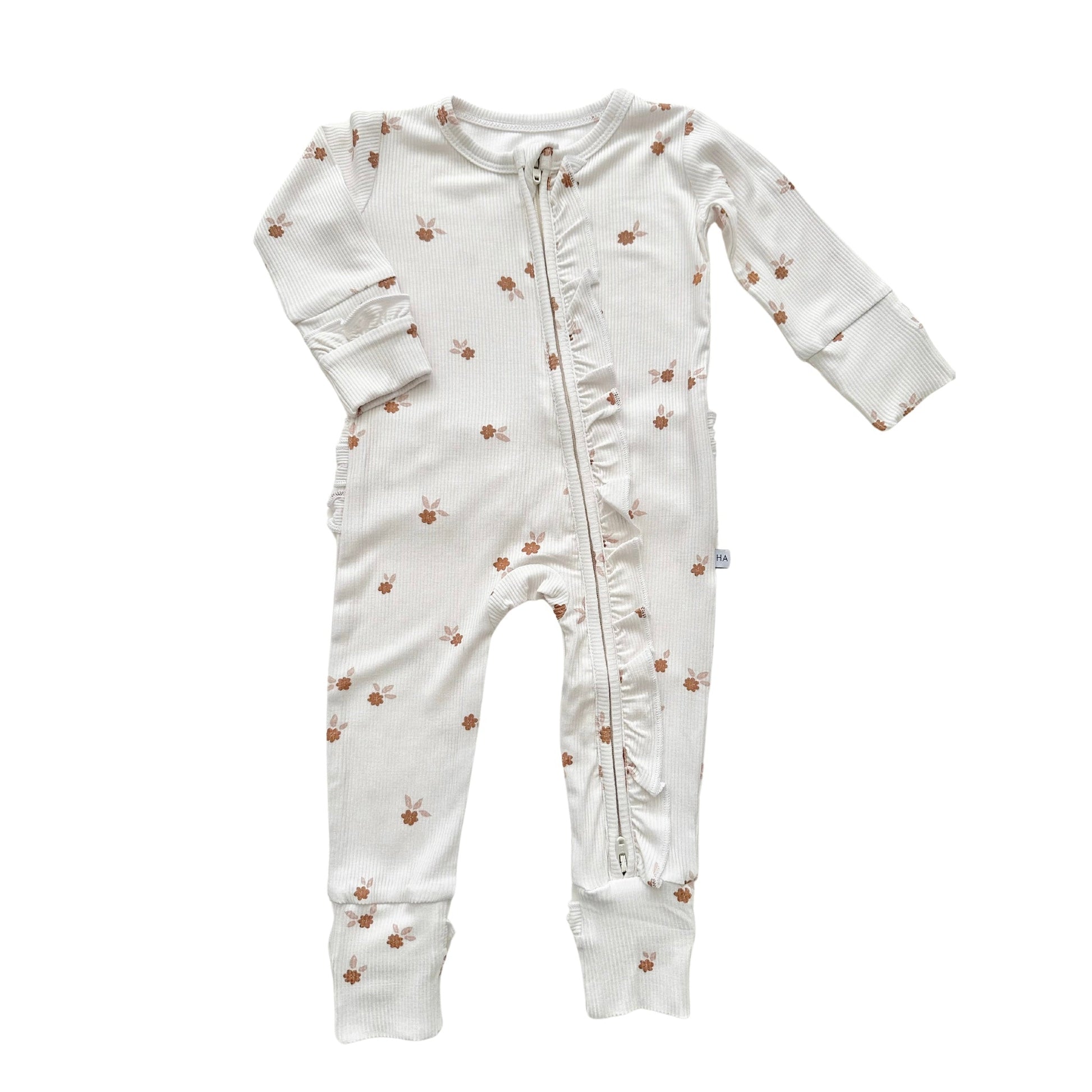 Introducing our ribbed Fleur Bamboo Ruffle Baby Zipper with sweet ruffle details. Crafted from ultra-soft and eco-friendly bamboo fabric, each romper ensures your little one stays comfortably stylish. The practical zipper design makes dressing and changing hassle-free, perfect for active babies and busy parents.
