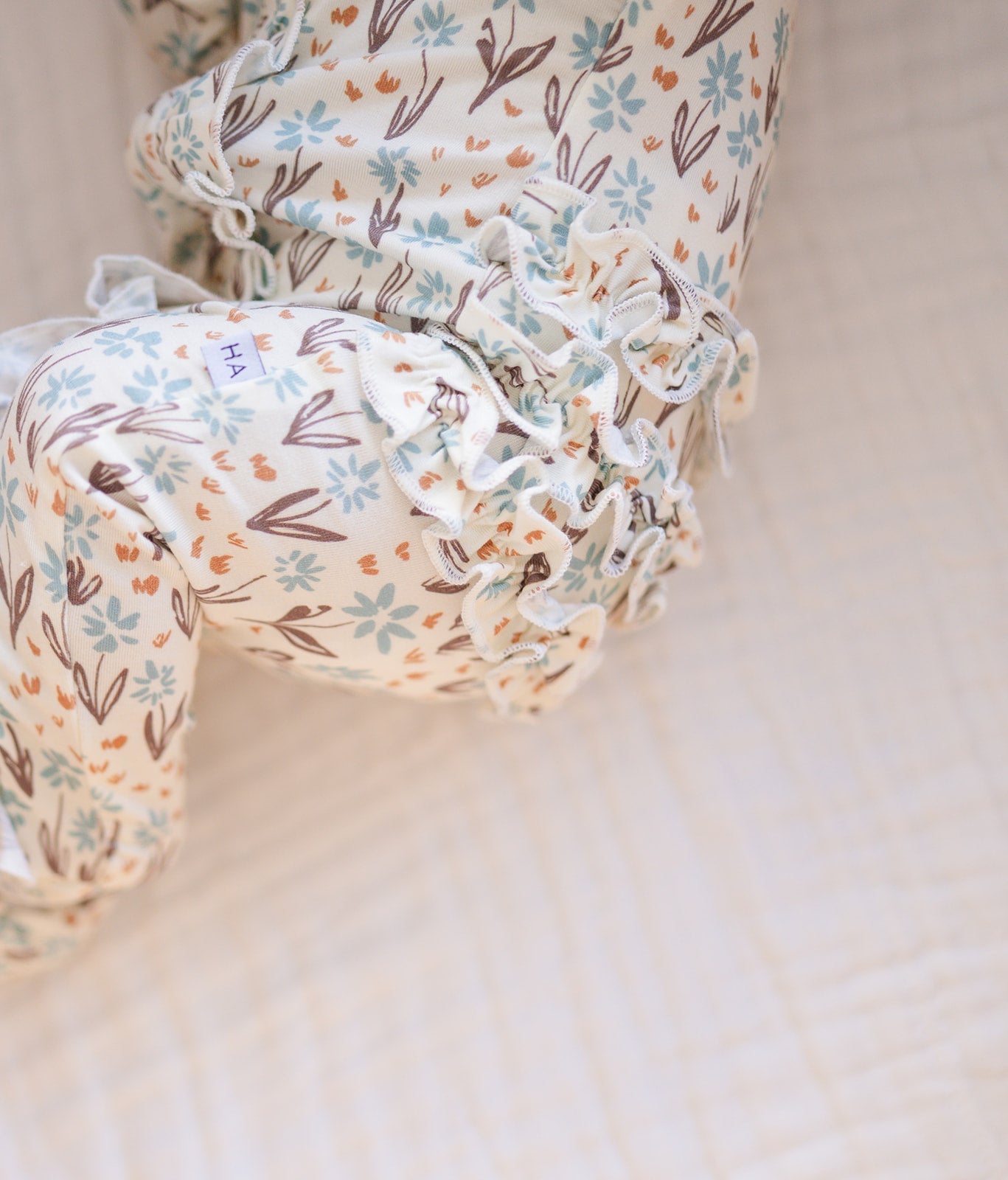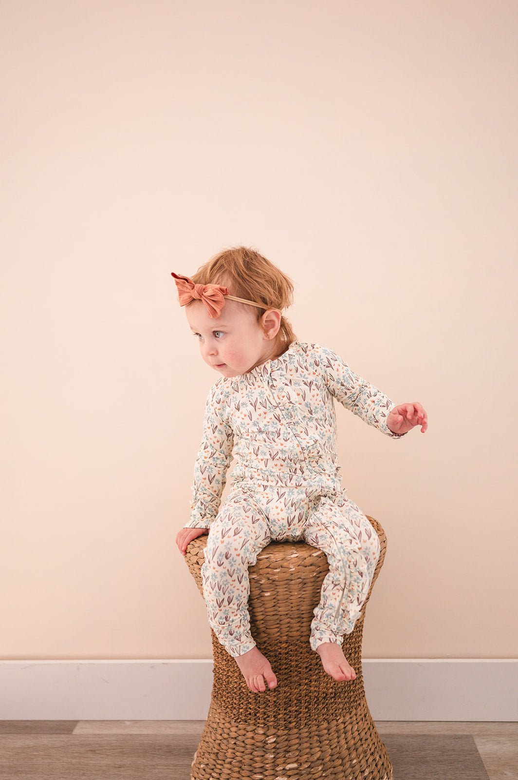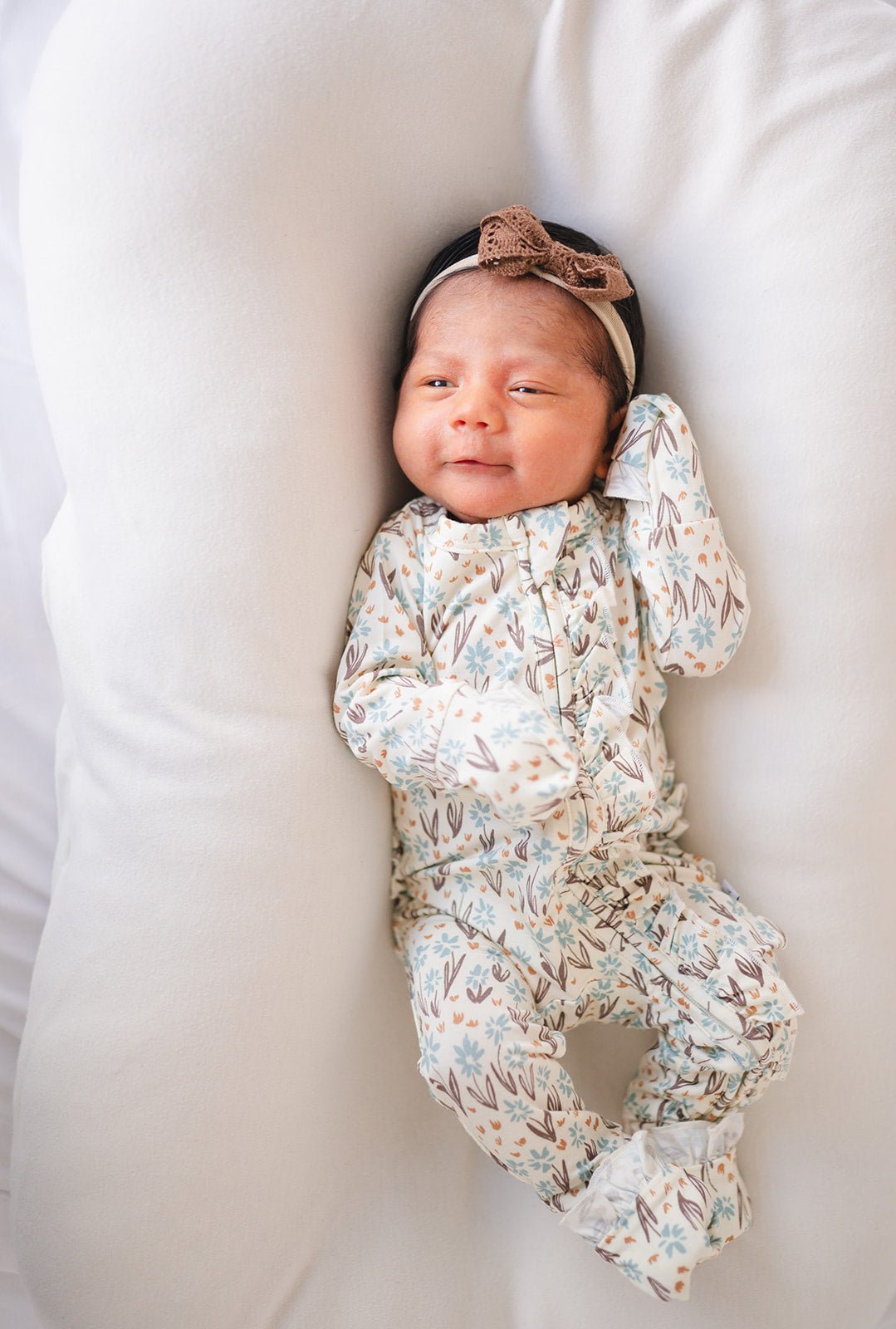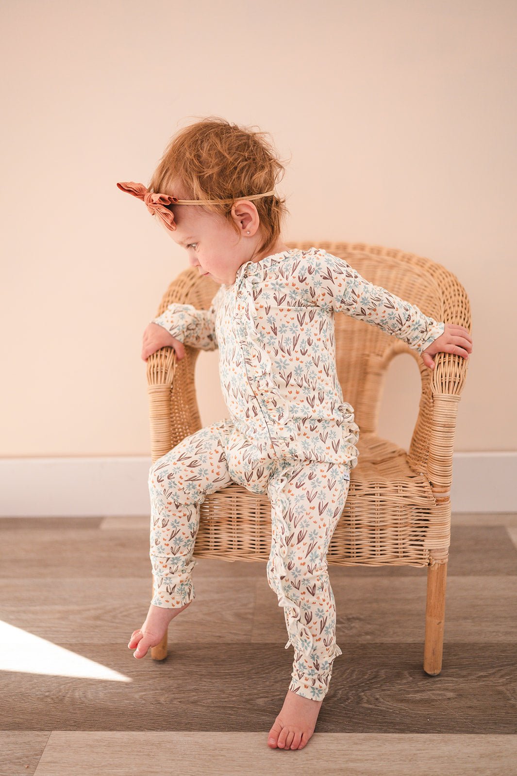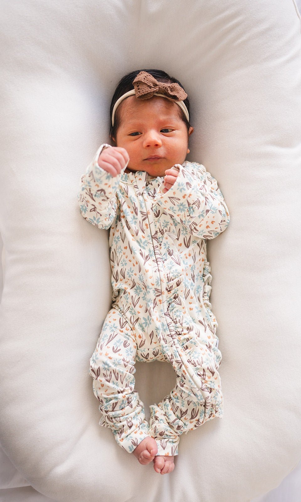 Ultra- soft viscose bamboo baby pajamas in our La La Floral design. Featuring adorable ruffle details, fold-over hands and feet on all sizes, and a 2-way zipper closure. Keep your baby cozy and chic with this versatile choice.