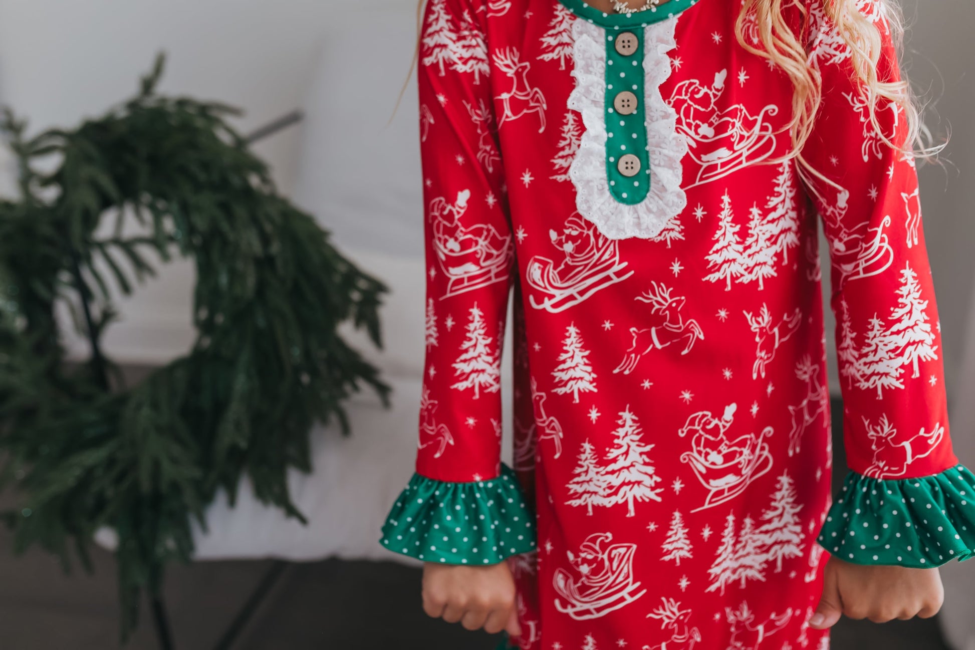 Cozy up this holiday season in the Girls Santa Sled Lounge Gown! Designed for comfort and festive fun, this gown features a playful Santa sled motif and polka dots that spark holiday cheer. Perfect for lounging by the fire or unwrapping presents, it keeps little ones snug and spirited all season long.