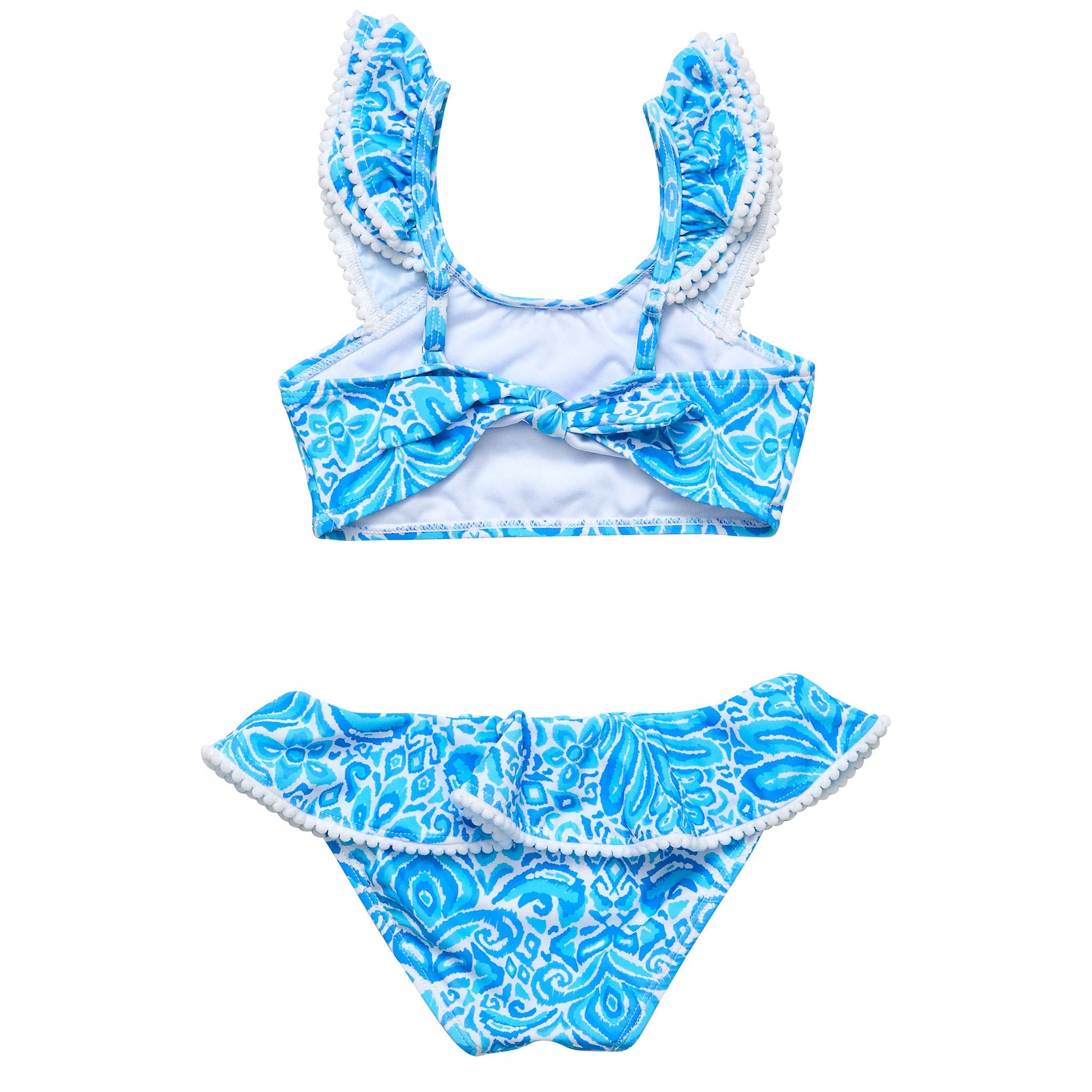 Don't settle for ordinary children's bikinis- brighten up your child's swimwear collection with the Santorini Blue Frill Crop Bikini. Made in our mesmerising Santorini print, this bikini is adorned with shoulder frills, a playful mini pom pom trim and mock tie back, making this bikini a popular piece for any summer outing.