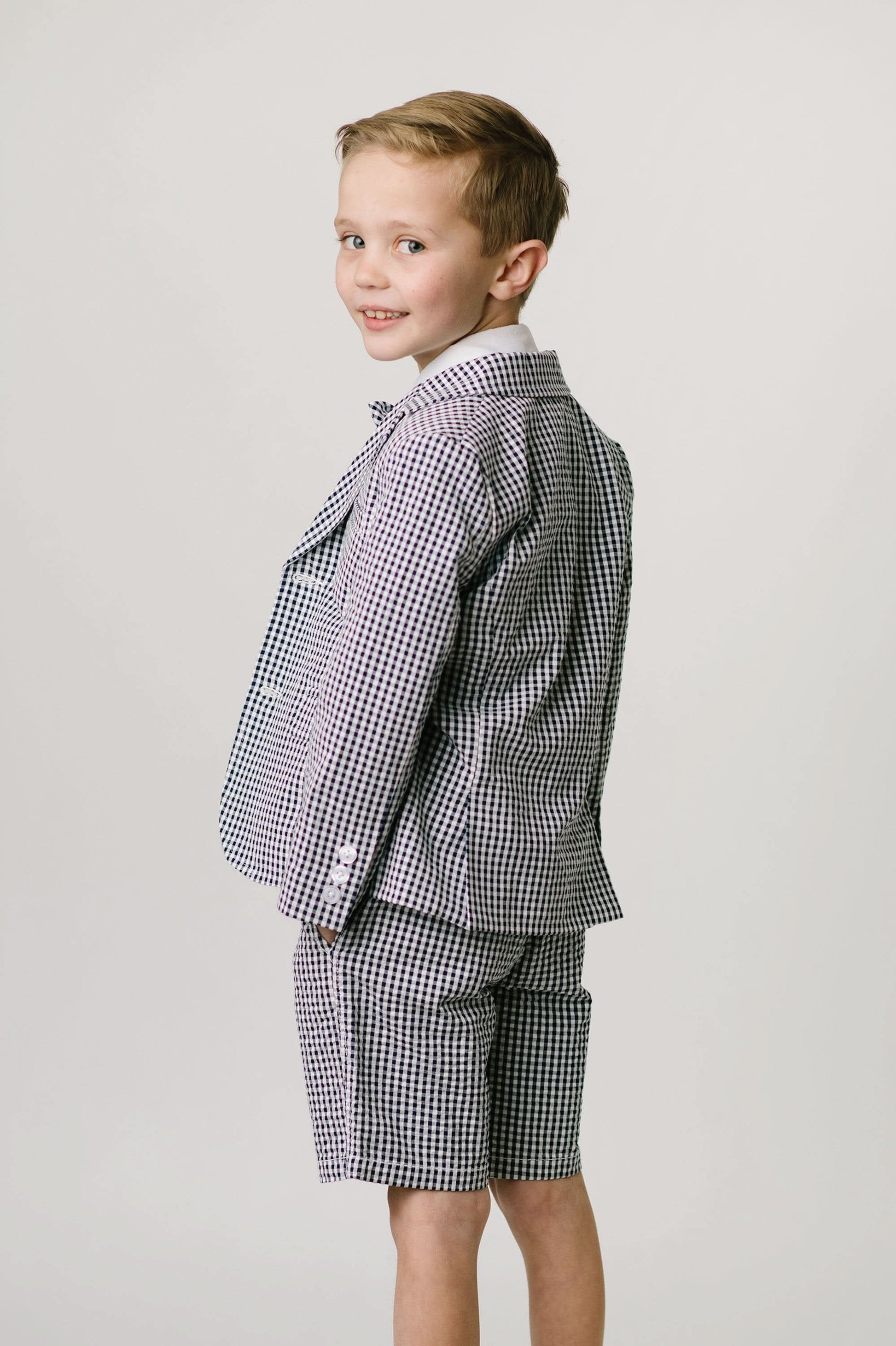 Our traditional seersucker blazer shows off his preppy style to perfection. Ours is cut in yarn-dyed organic cotton seersucker, featuring all the classic details: button front with faux horn buttons, notch collar, welt chest pocket, functional front flap pockets, and fully lined.