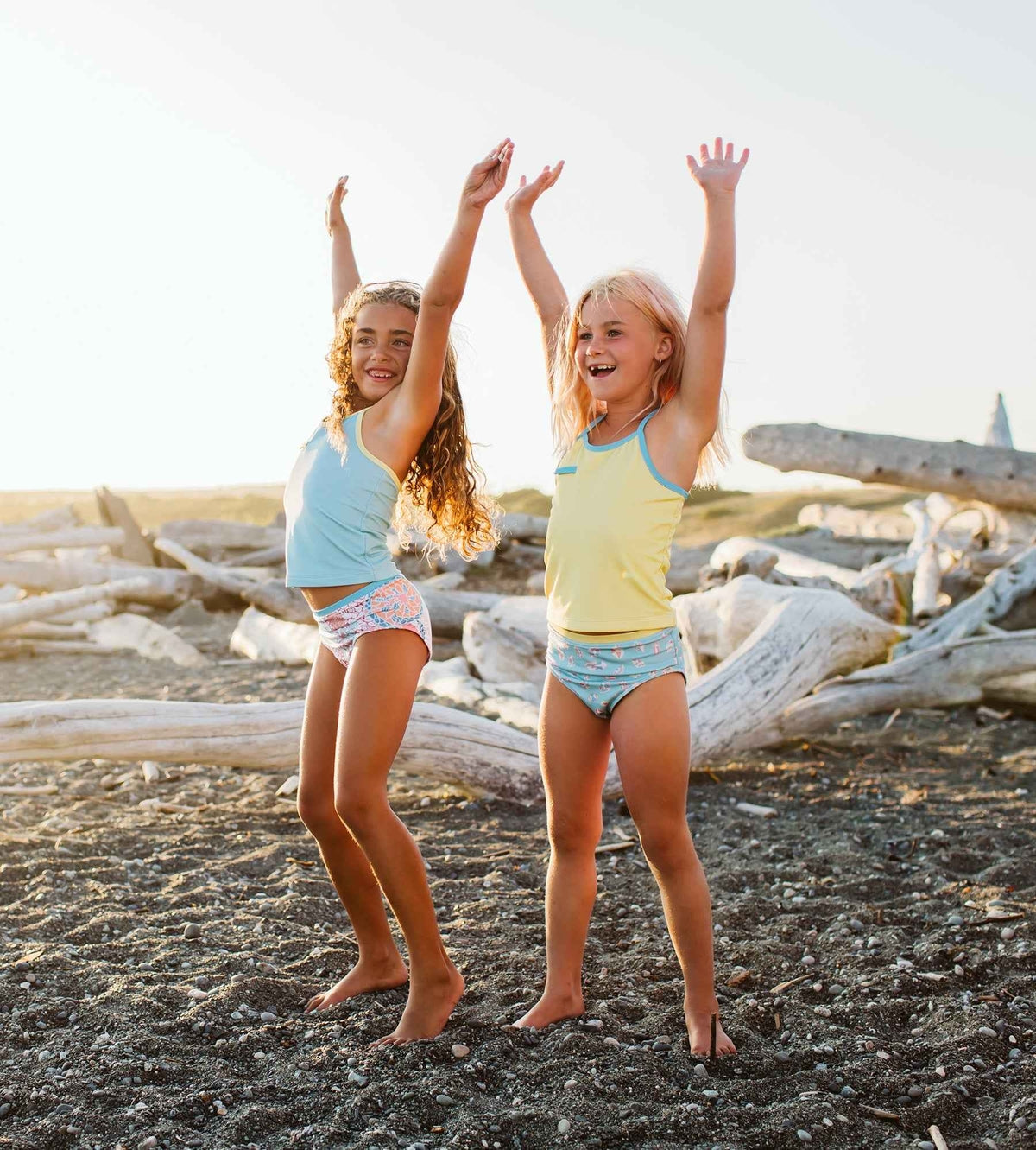 The Simone Tankini Set will quickly become a staple in your girl's swimwear, and let them grow! Complete with our signature goggle loop and hidden back pocket, tots and tweens love this style. Choose between four hand drawn designs and colors, there's one for everyone!