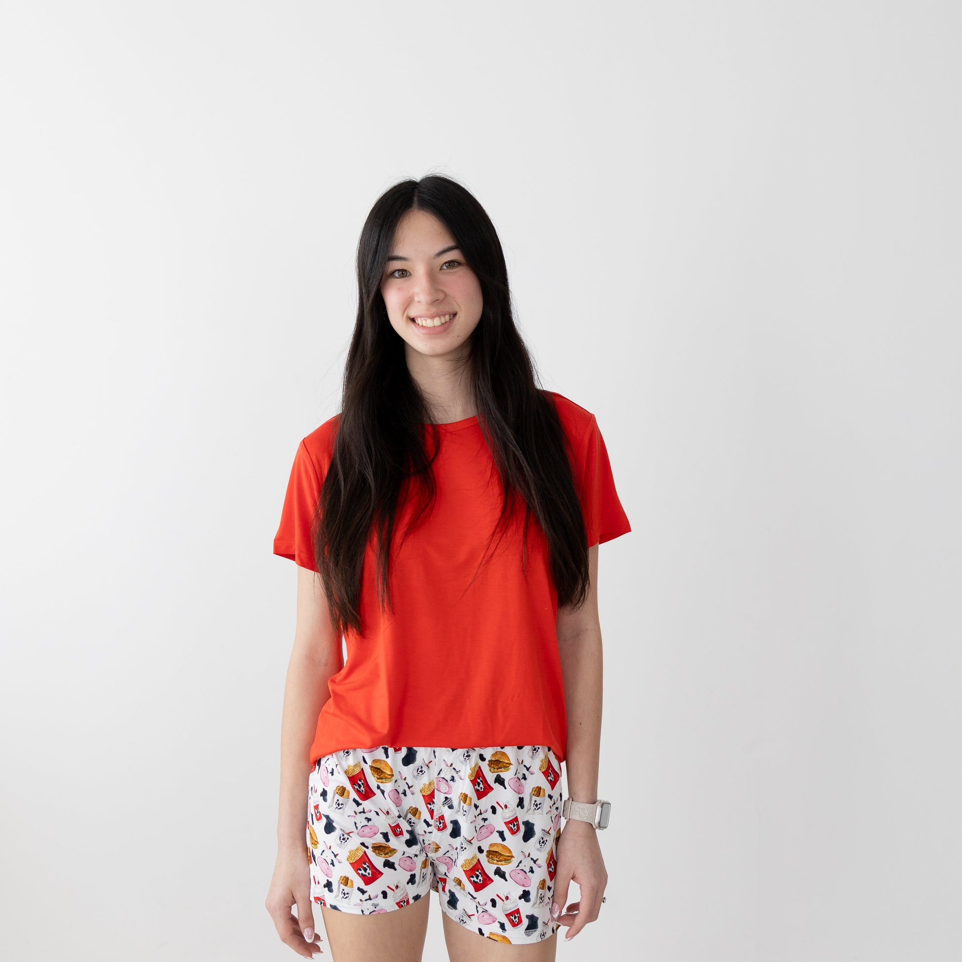 Soft, stretchy, and made for little snack lovers, our Snuggies & Nuggies Youth Shorts Set is as fun as it is comfy! Featuring a bold red tee and boxer style shorts with buttons, this adorable set is covered in chicken nuggets, fries, and milkshakes—because the best outfits should be as awesome as their favorite treats!