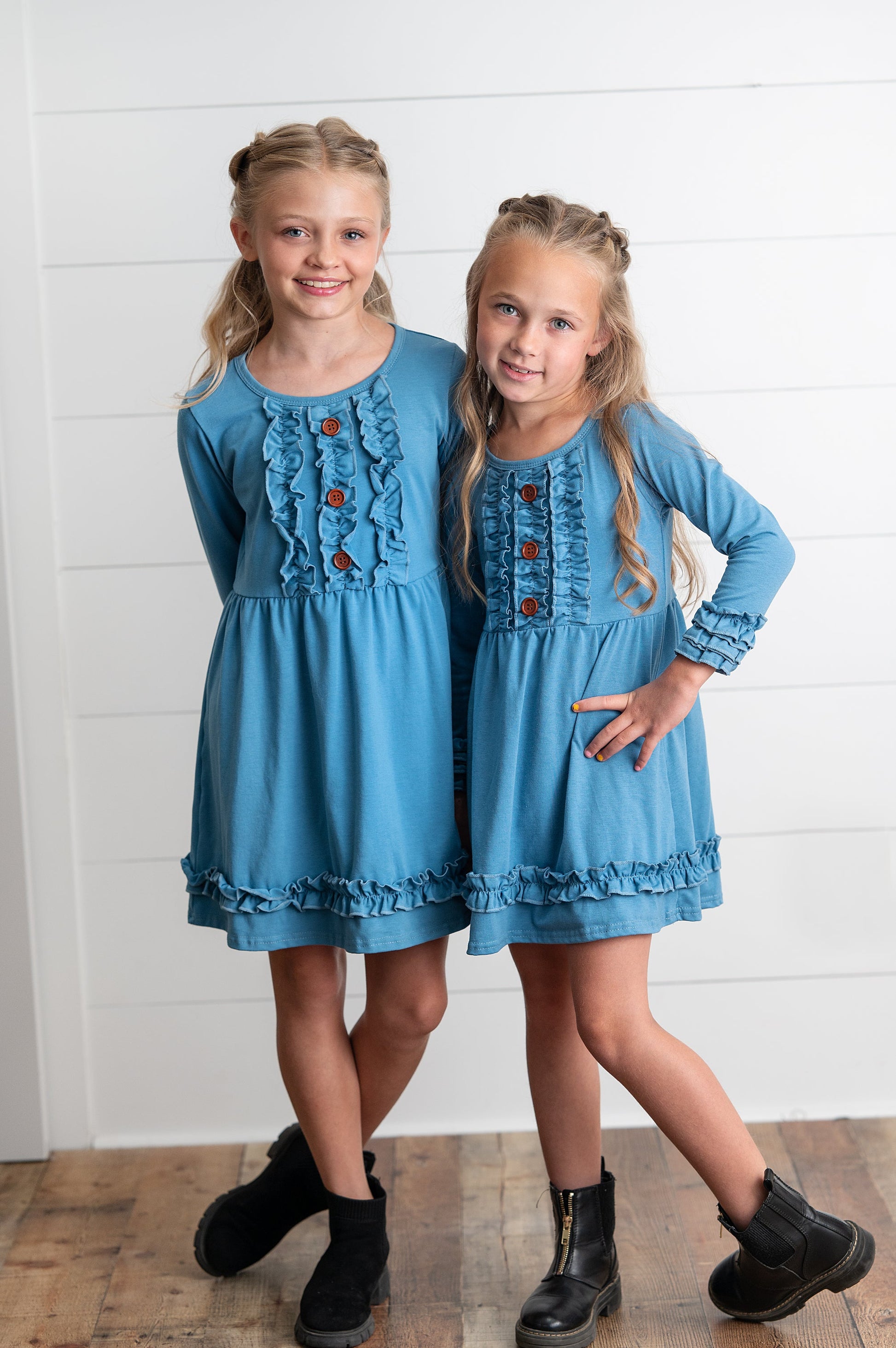 Get ready to have some fun with our Blue Ruffle Long Sleeve Dress! Perfect for girls who love to twirl, this dress features delightful ruffles and a charming shade of blue. Keeps your little one stylish and comfortable all day long!