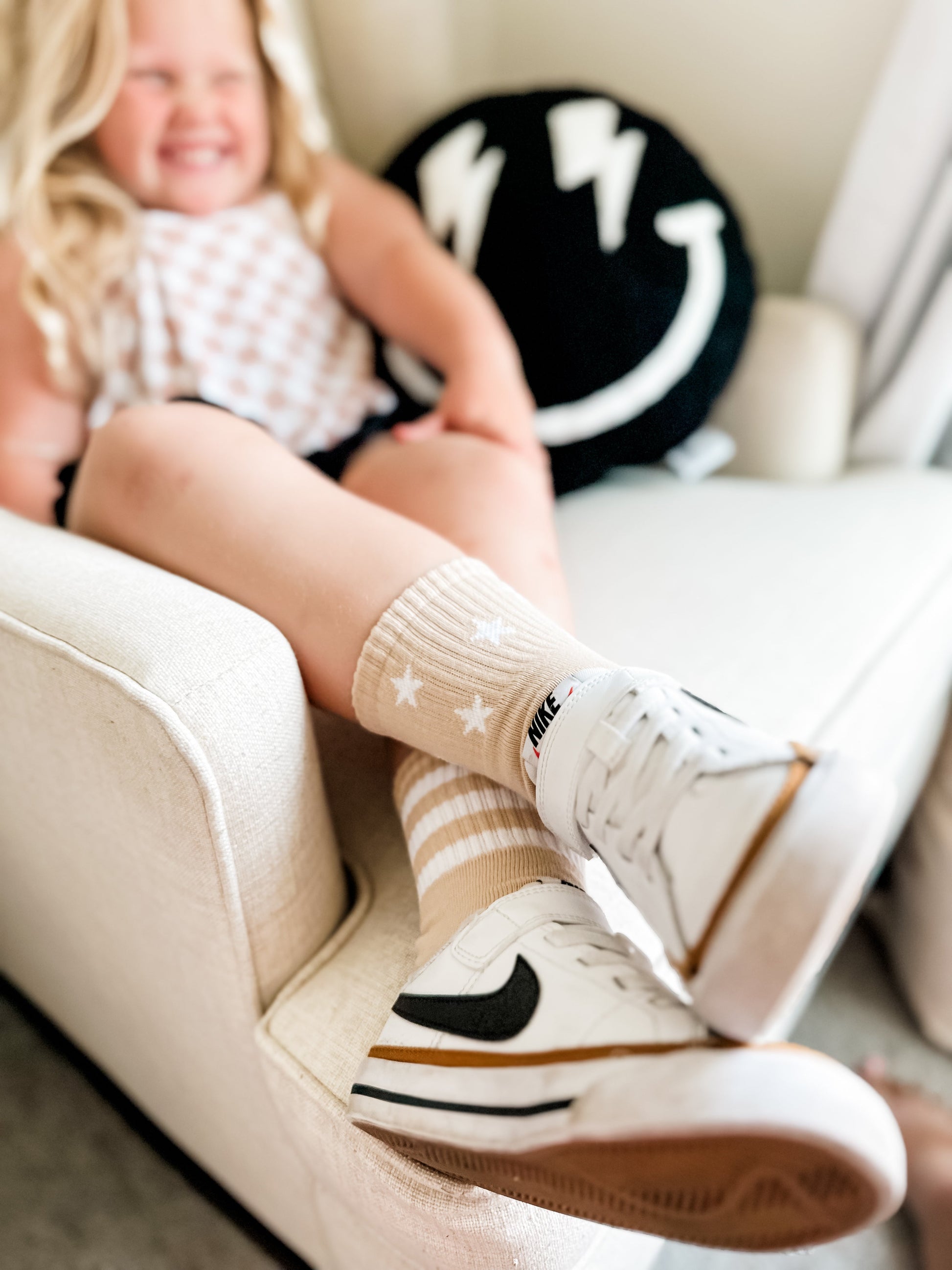 Sizes Infant/XXS, Extra Small, Small + Medium have logo grips on the bottom of the sole.