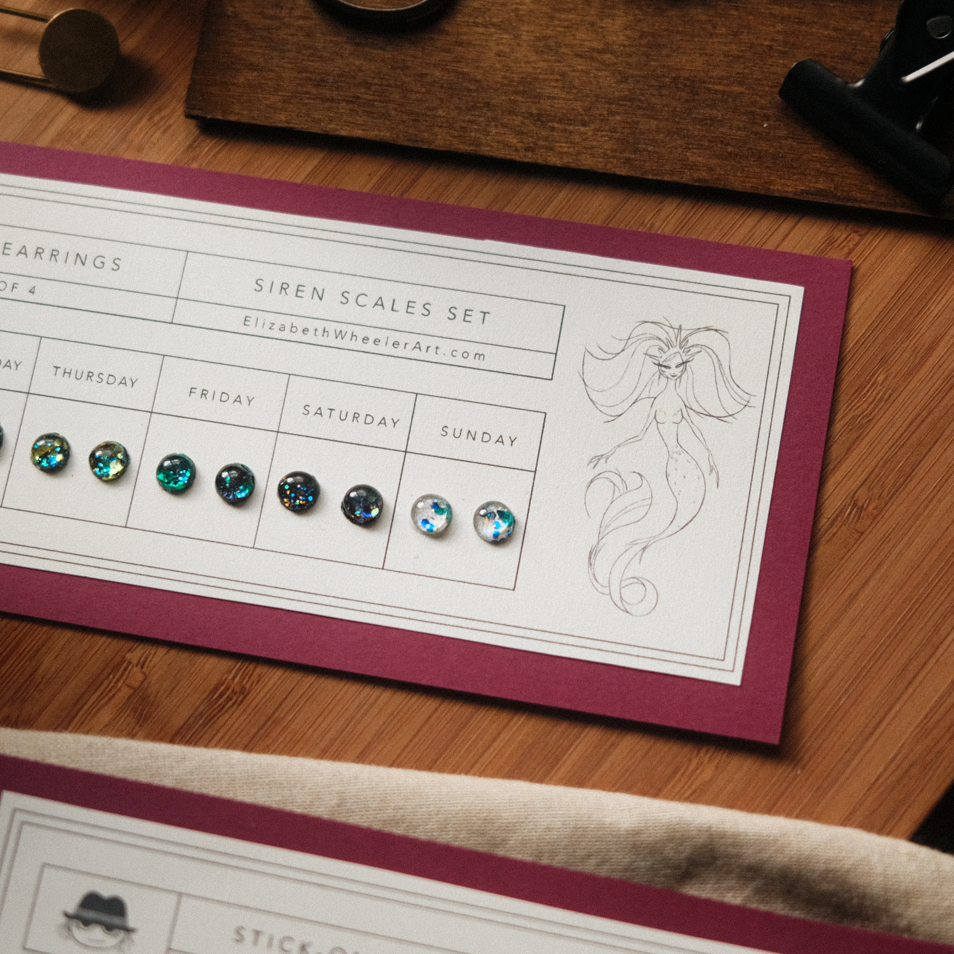 A flash back to the past, this Siren Scales Stick-On Earring set features a new color for each day of the week! Earrings are metallic-holographic and shimmer in the light. Just peel and stick! Each stay on up to 24 hours. Since each item is handmade, please allow slight differences between orders.