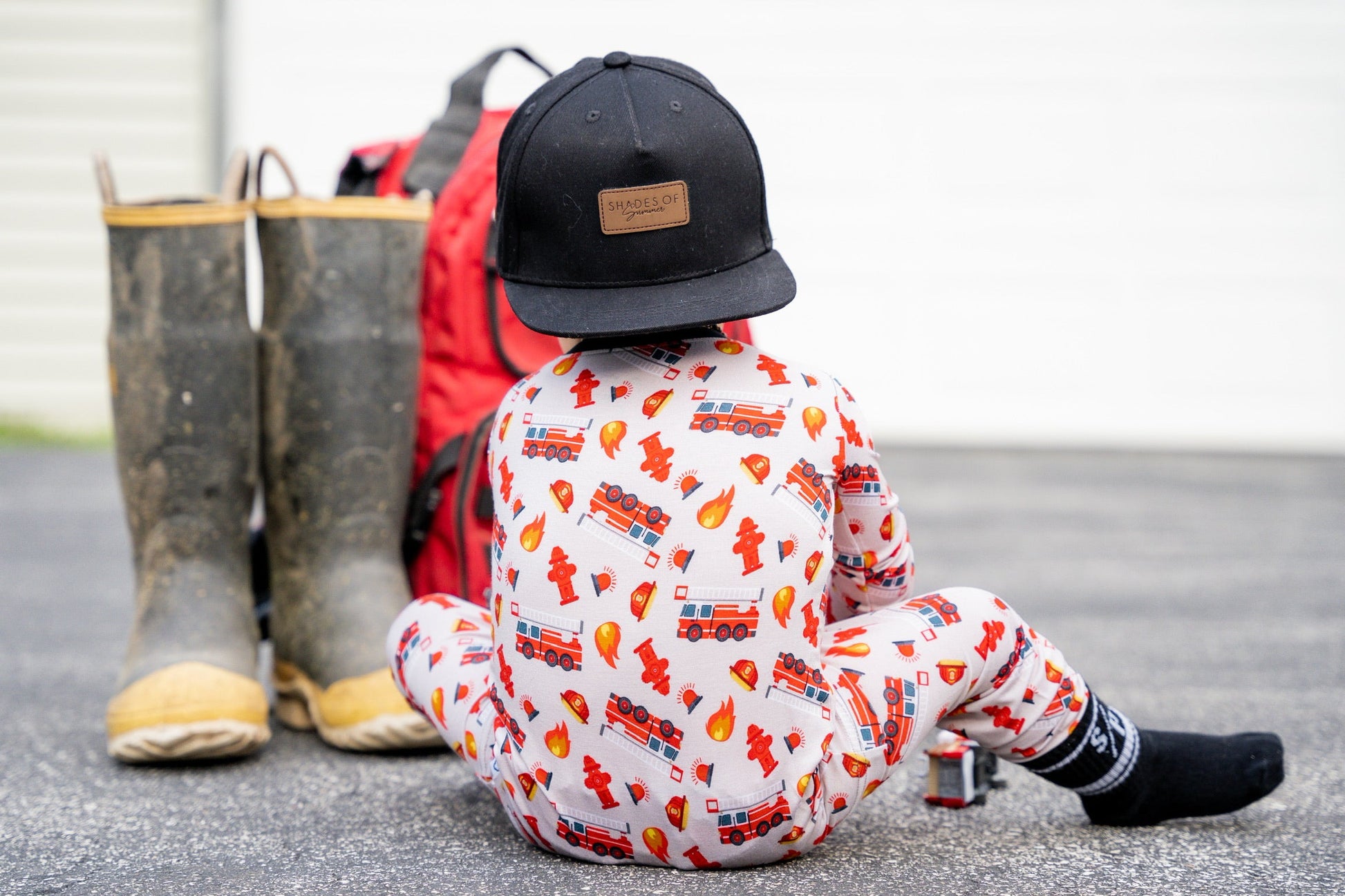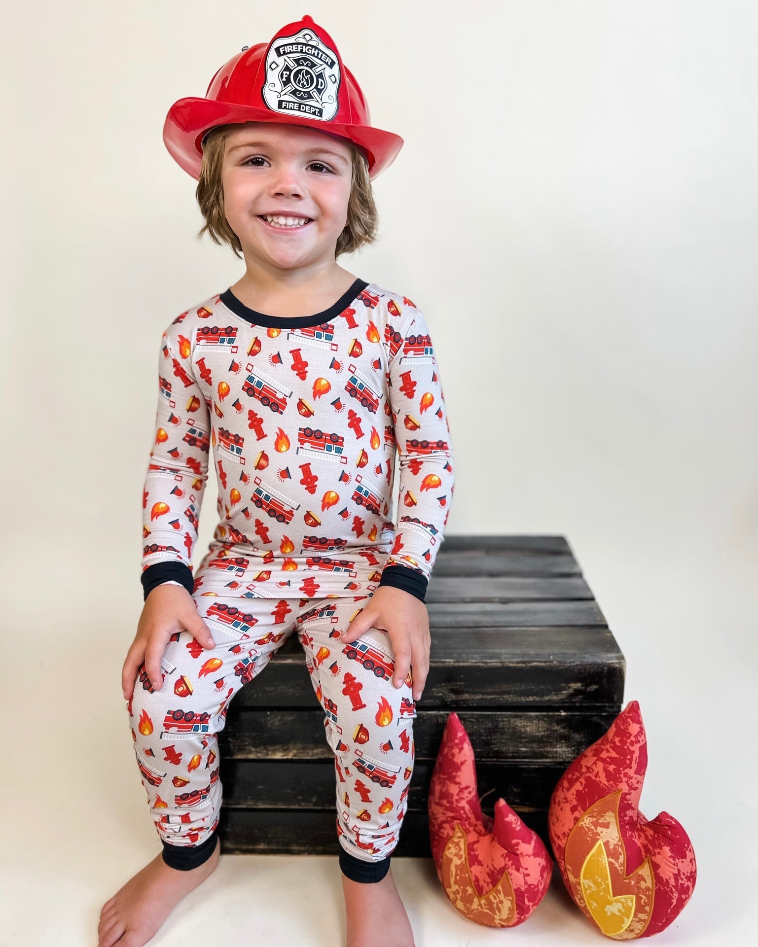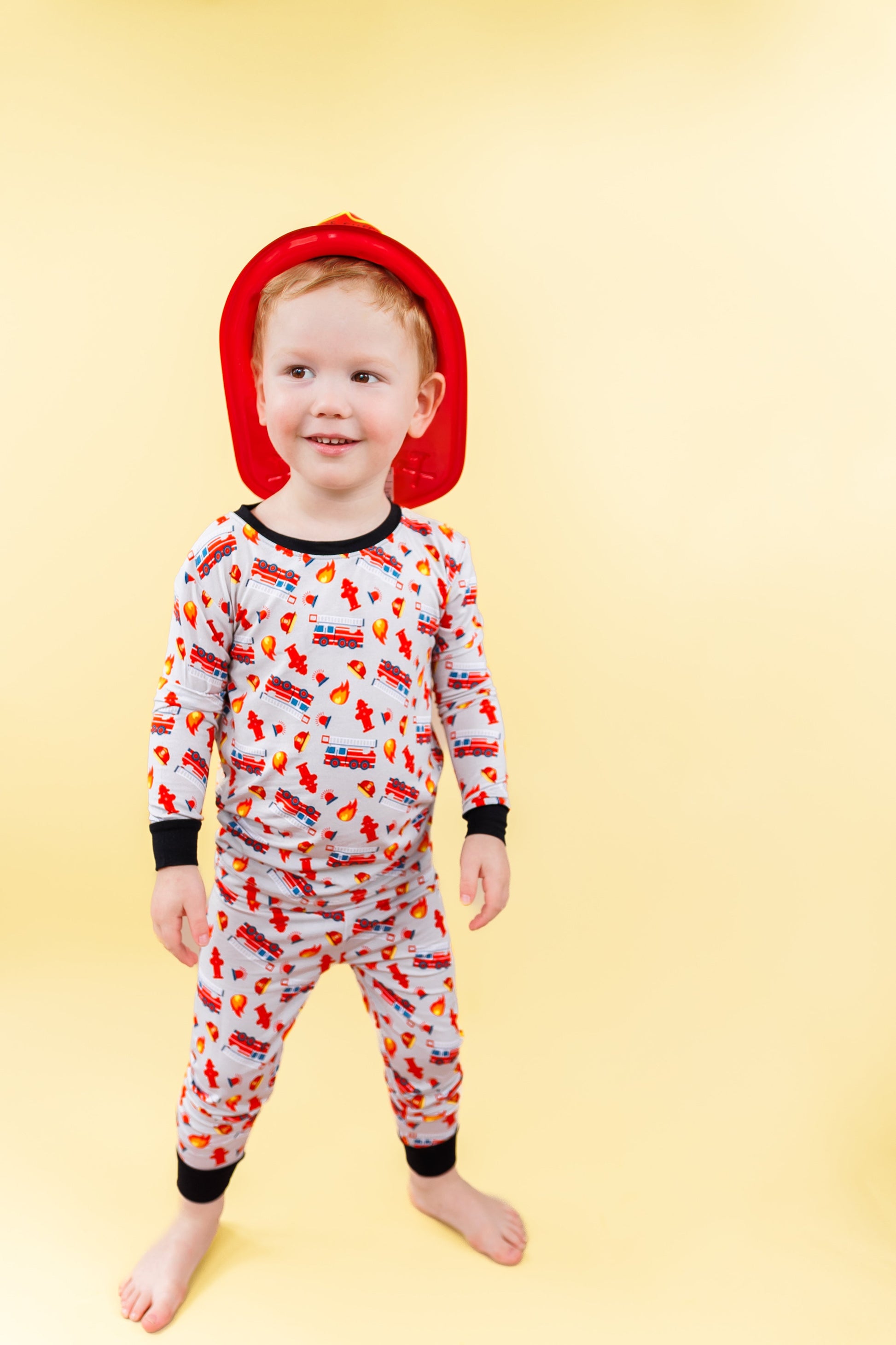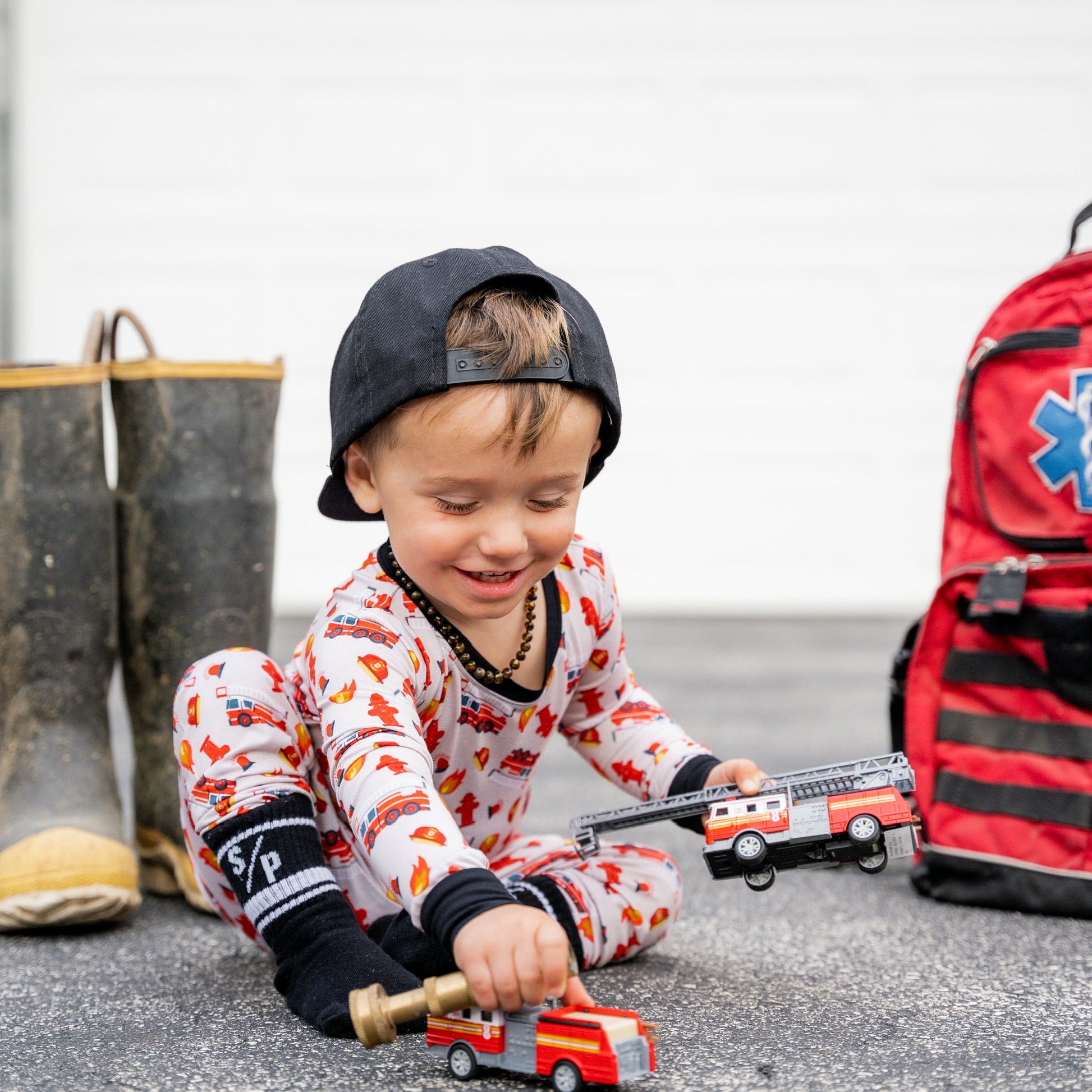Get ready to fight bedtime blazes with our Stop Drop & RollZzz Dream Set. Made with bamboo material, this comfortable and soft long sleeve dream set features a fire truck theme that will have your little one dreaming of heroic adventures. Don't snooze on this dreamy set!