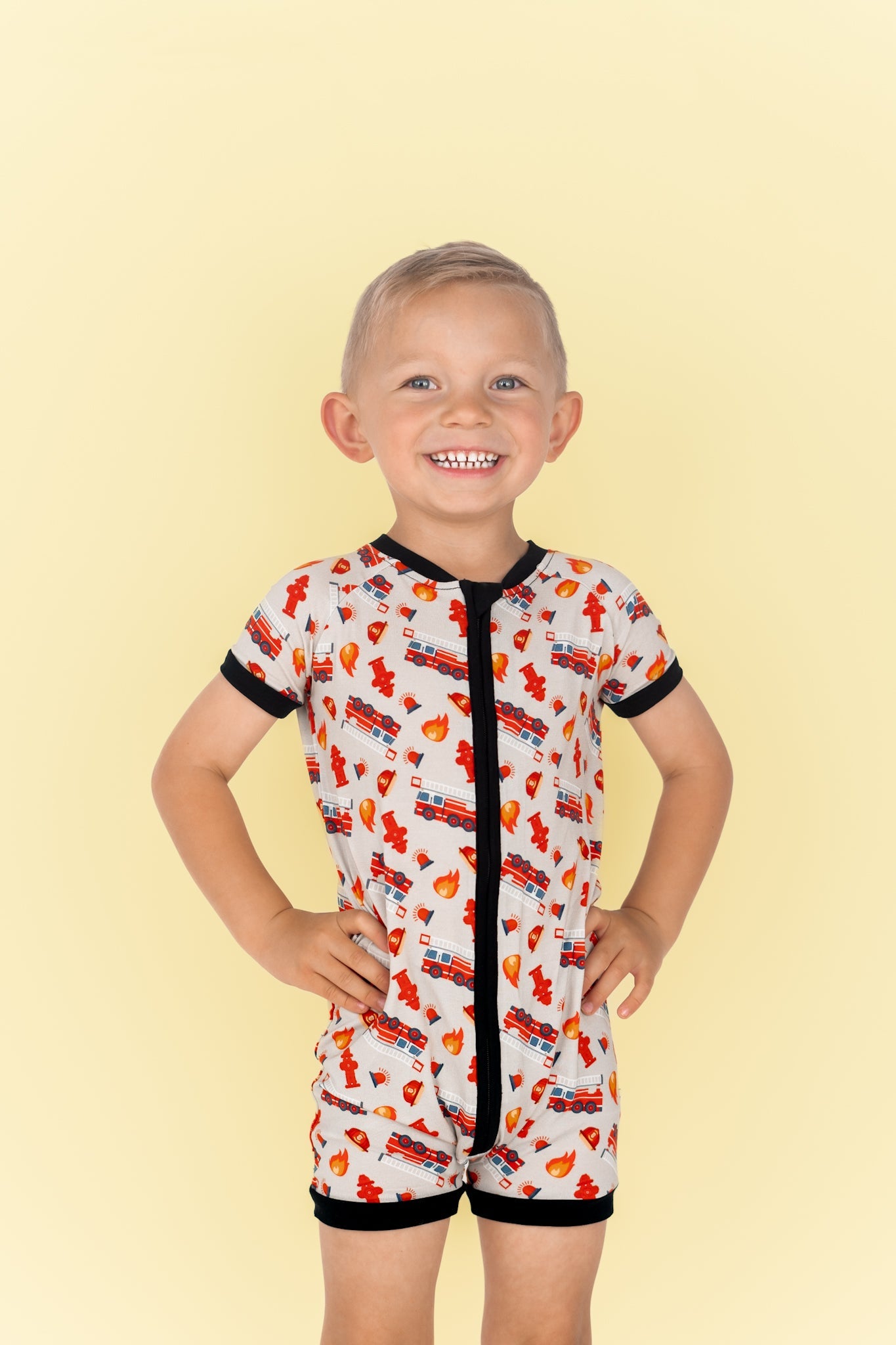Roll into comfort and style with our Stop Drop & RollZzz Dream Shortie! This short style romper features a playful fire truck print and is made from soft and comfortable bamboo material. Get ready to dream away in this quirky and cozy piece.