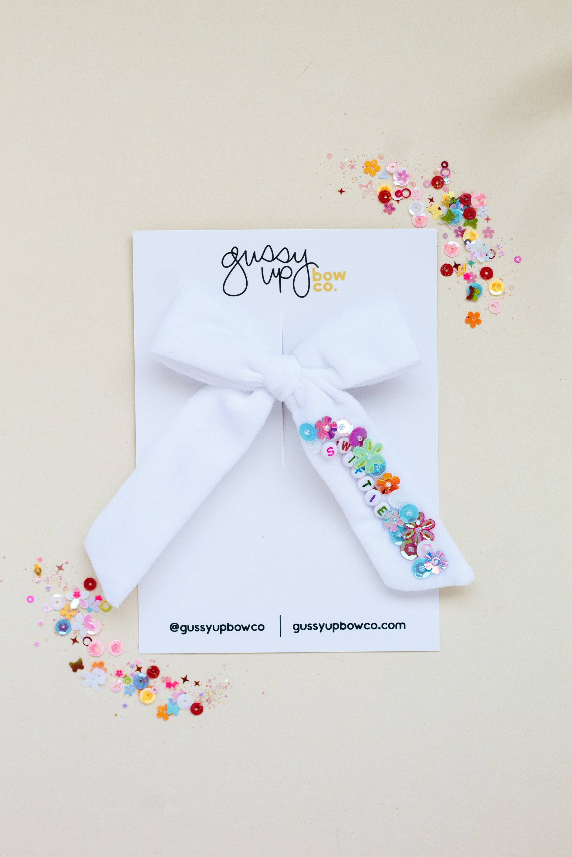 Step into the world of adorable hair accessories with Gussy Up Bow Co's Swiftie Velvet Extra Sequin Bow. Perfect for kids, this hair bow adds a delightful sparkle to any outfit. Handcrafted by Clarissa, a mother with a passion for cute and creative accessories, it's more than just a bow. It's a piece of her journey from a basement to entrepreneurship. Every purchase also supports The Corinna Project, gifting bows to hospitals and new moms. Enjoy this charming accessory while making a difference!