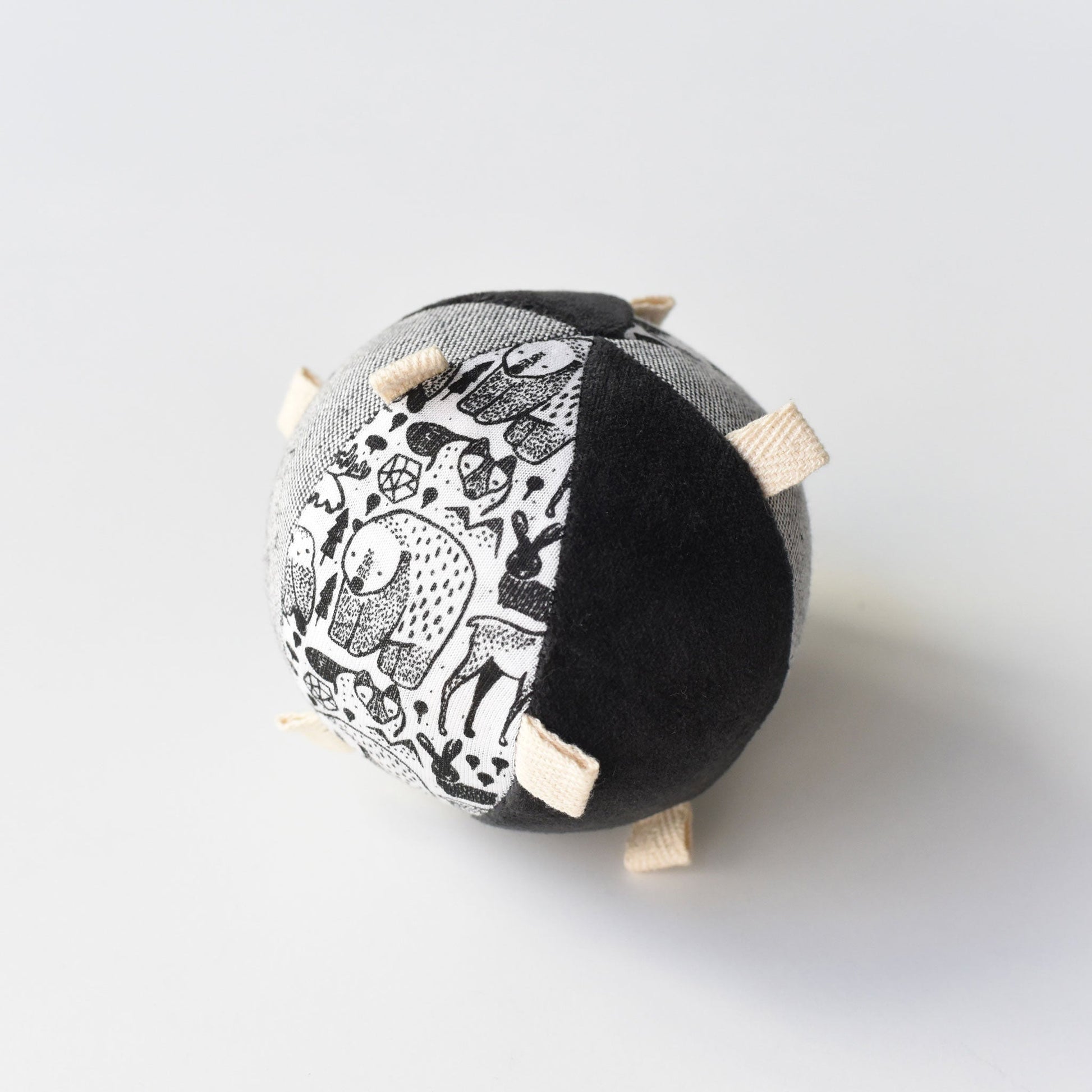 Baby can explore the world through touch, sight, and sound with our classic Montessori-inspired Taggy Ball.This soft ball, made from a patchwork of organic fabrics, features an array of little tags perfect for tiny hands to grip, tug, and explore.