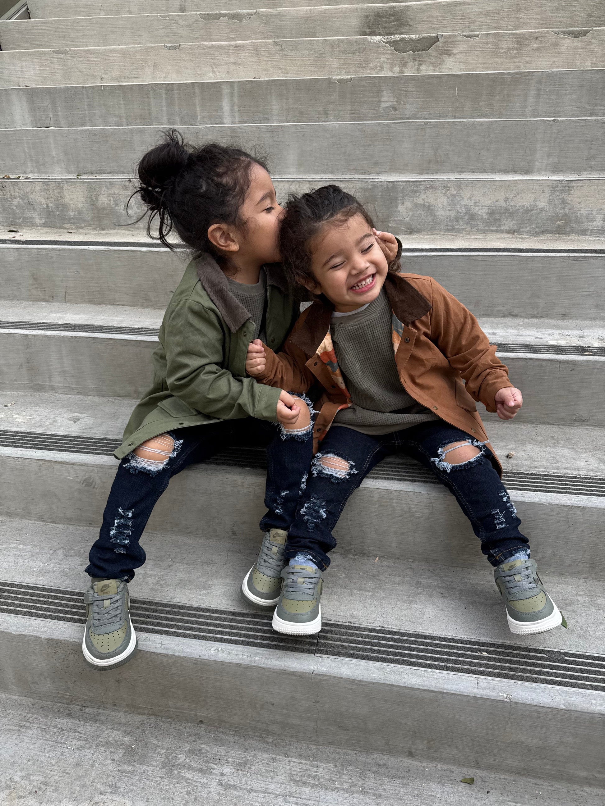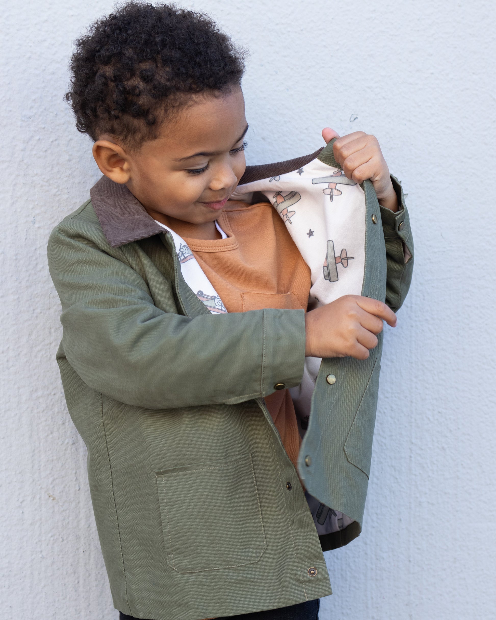 Polyester blend making this an ultra-soft, medium weight jacket with a kid-designed lining. Finished with brushed gold snap buttons for easy bundling!