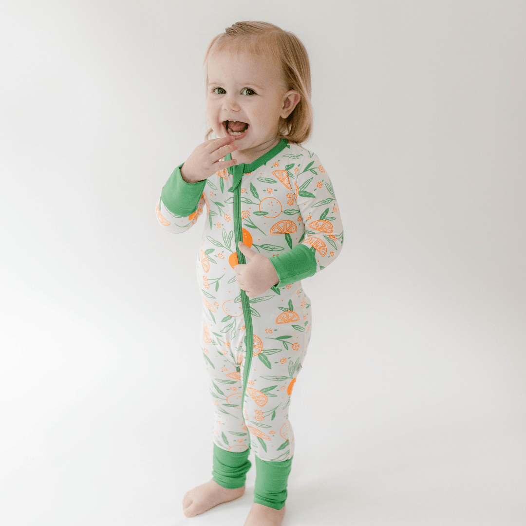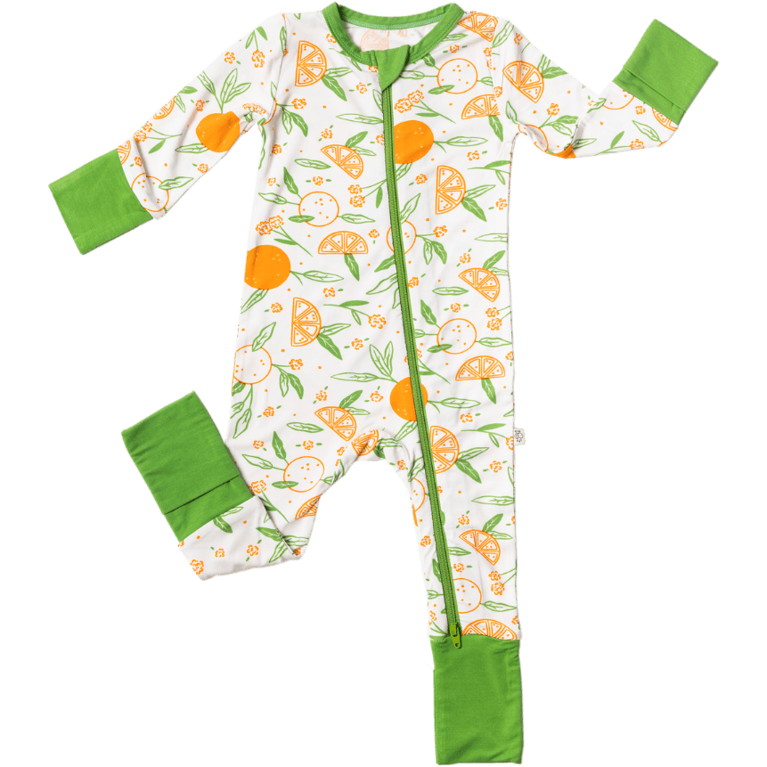 Oranges is a hand-illustrated print capturing a sun-drenched afternoon at the grove. The citrus and leaves are arranged on a light fabric that's equally wearable for sleep and play.