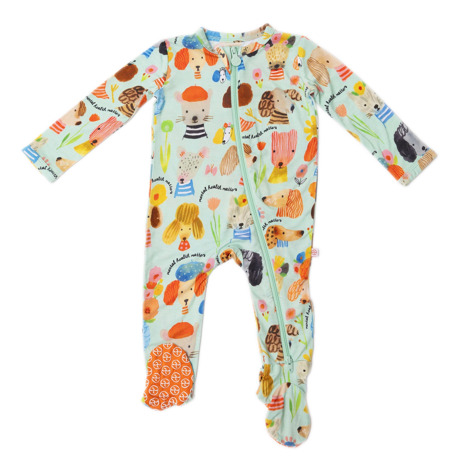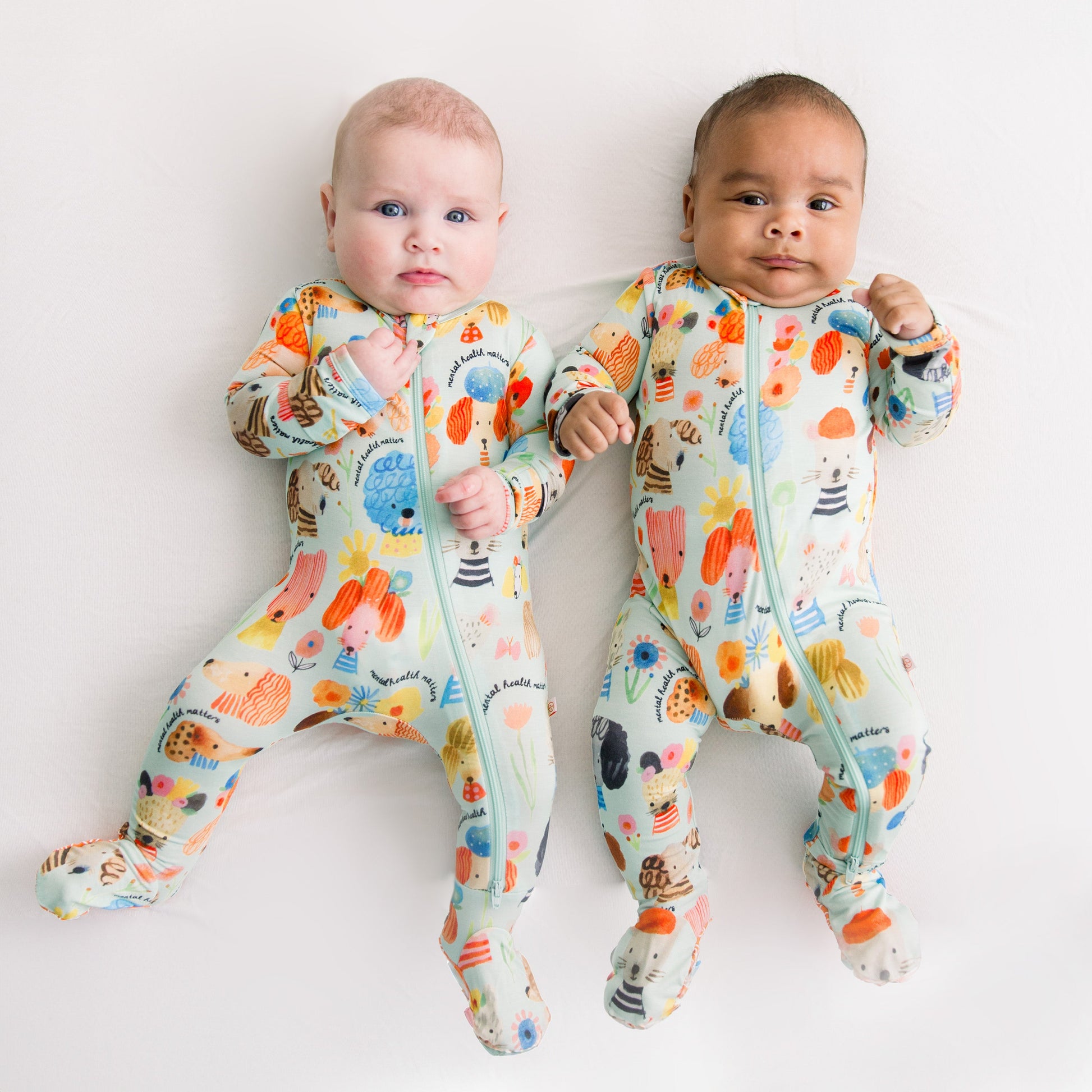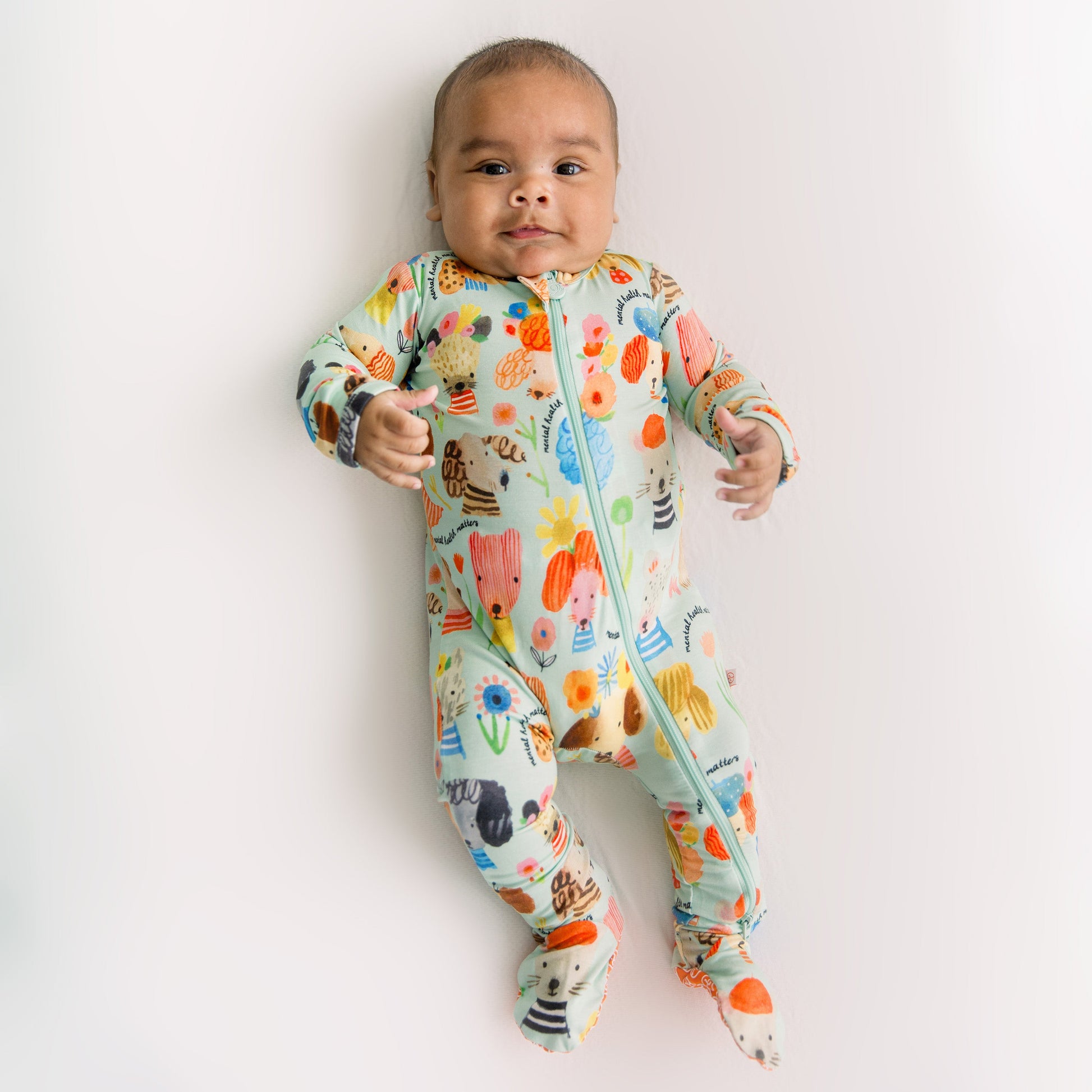 This footie zippered one piece was made with mama (or dada) in mind. Our bespoke, hand-drawn prints are crafted into buttery soft baby pajamas to comfort a tired and struggling mama and spark some joy in her day.