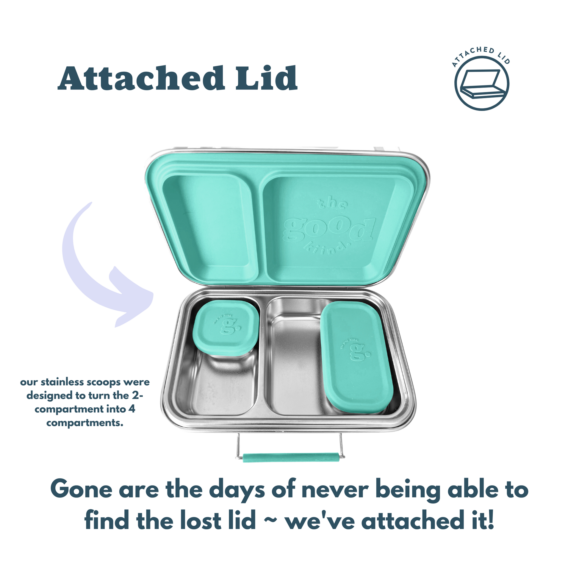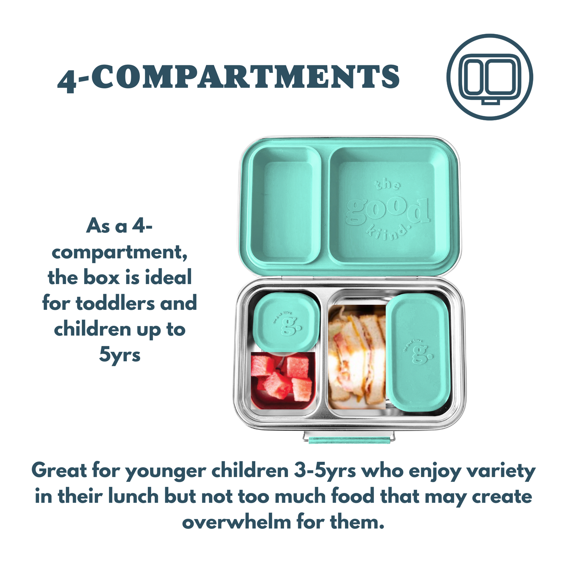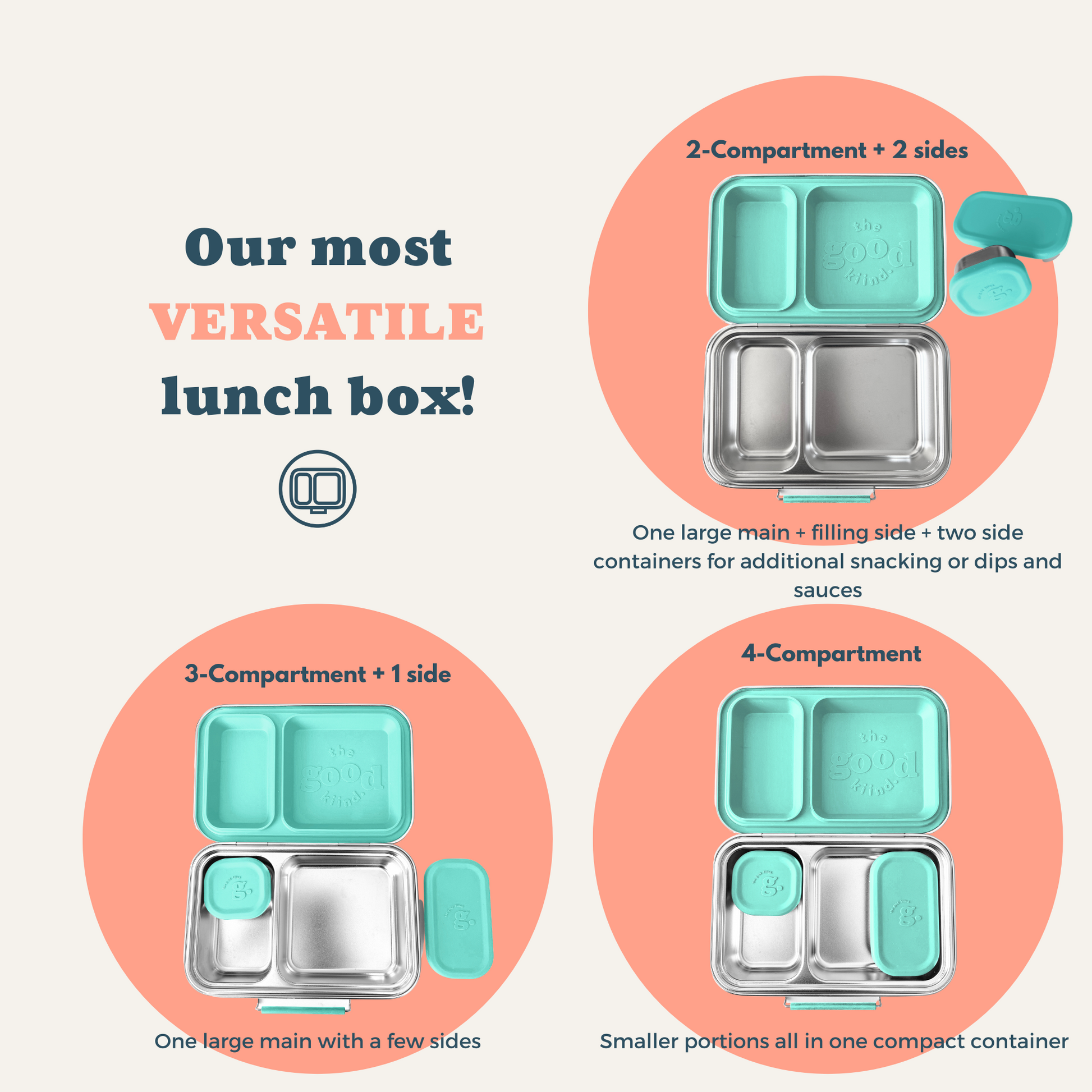 The Snacker™ lunch box is our most versatile container yet! Robust and durable, this stainless steel, eco-friendly lunch box is built to withstand rough rides inside a backpack – while keeping your precious midday meal fresh and undamaged. Thanks to handy mix and match compartments, you can use this container as a 2- 3- or 4-compartment lunch box depending on your needs that day!