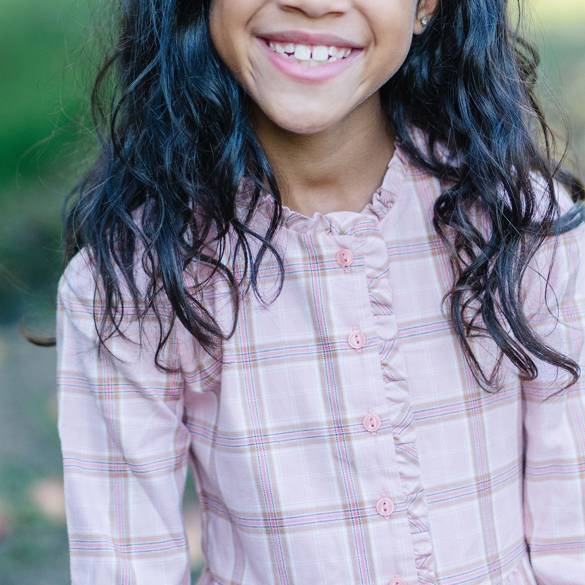 We love the feminine details on our long ruffle neck dress for fall. Cut from a soft organic cotton calvary twill, this dress features sweet ruffle trim at the collar and placket, tiered skirt, button front closure, and sweet lace trim along the collar. Lined in the bodice.