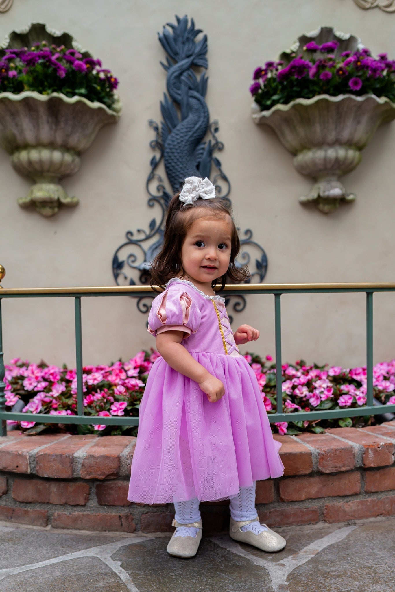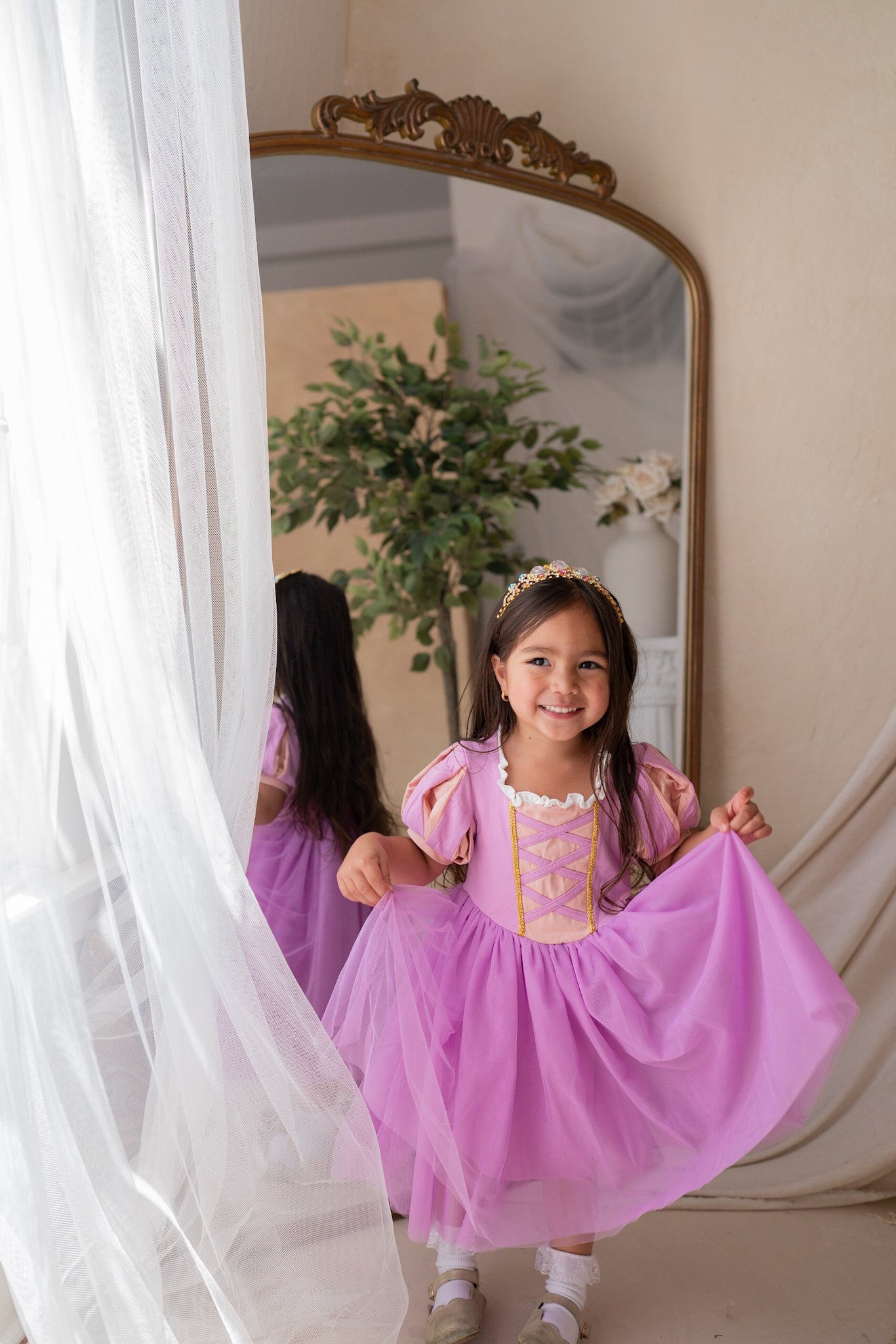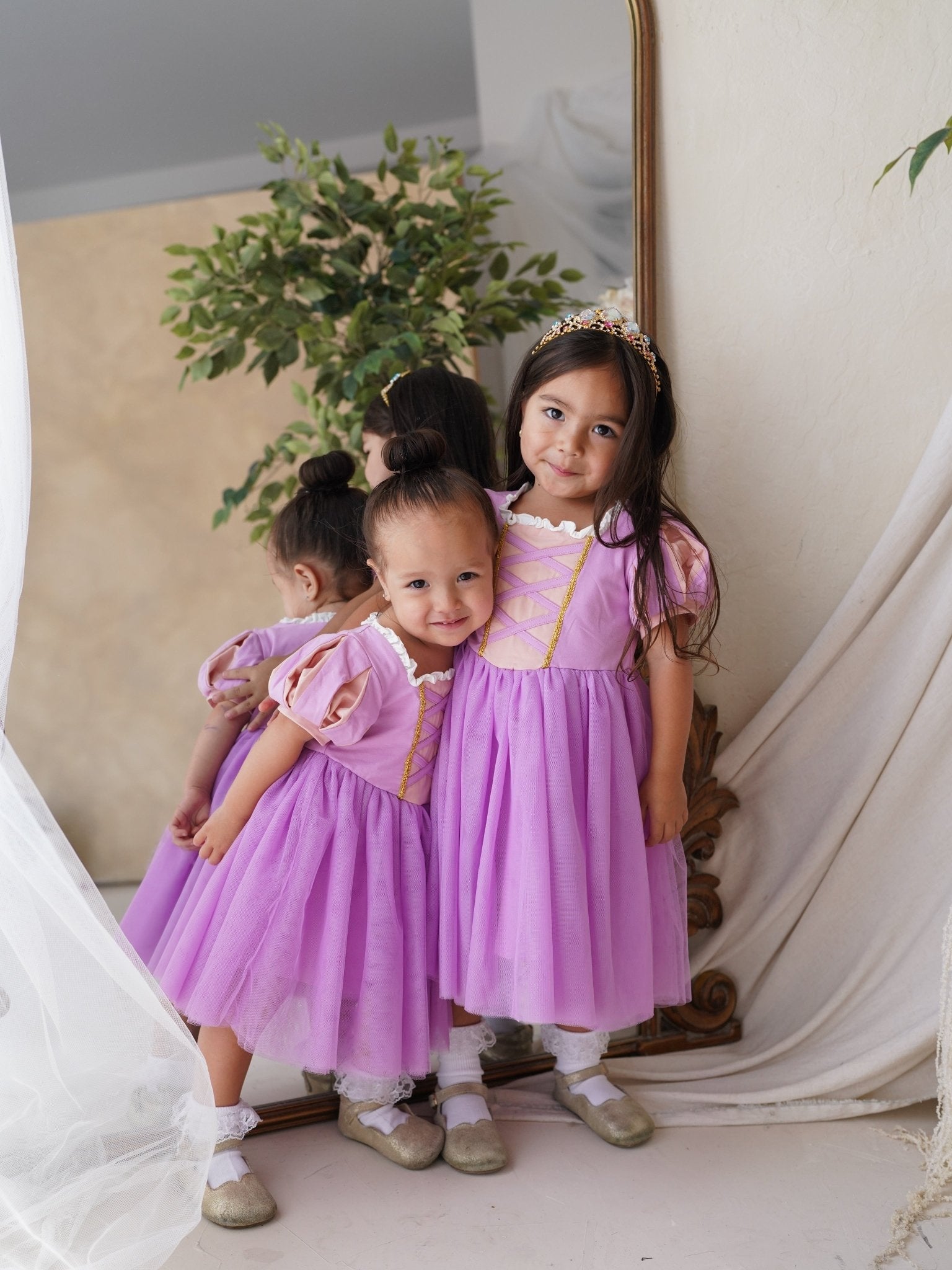 Let down your hair and step into a fairytale with our Rapunzel-inspired princess dress. Featuring soft puff sleeves, a lace-up satin bodice, and a full twirl-worthy skirt, this dress is made for magical adventures. Whether it's a birthday celebration, a visit to the most magical place on earth, or a day of dreamy play at home, this dress brings the enchantment.