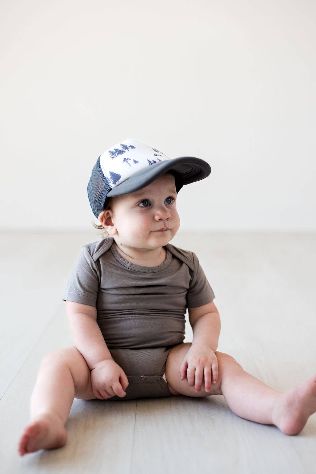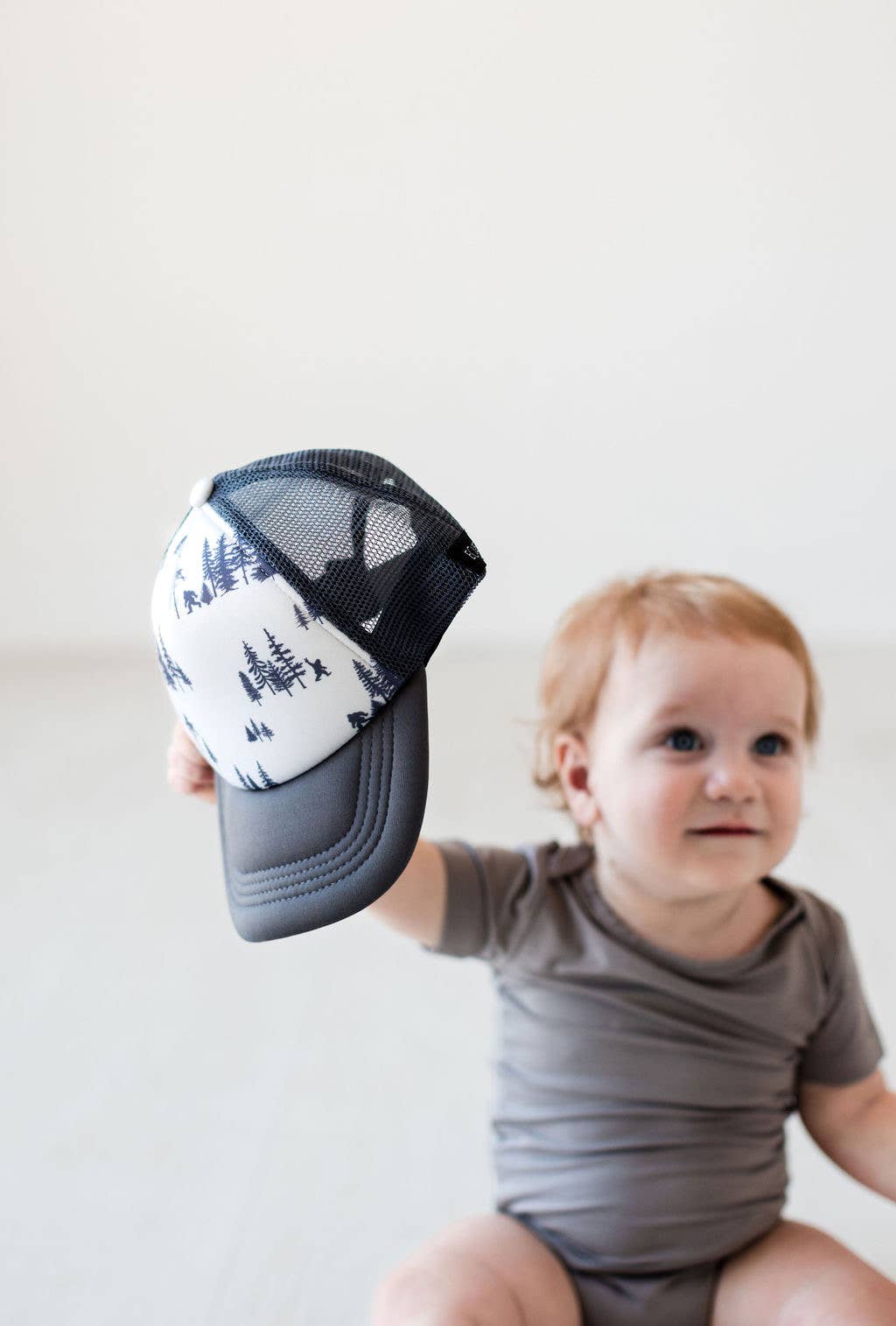 A need for any fall camping trips or woodsy activities. Bigfoot himself makes an appearance on our Sasquatch Trucker Hat! A solid beige background shows pops of dark gray pine trees and the elusive bigfoot! The design is finished with a mesh snapback to keep your kiddo comfortable no matter the weather.