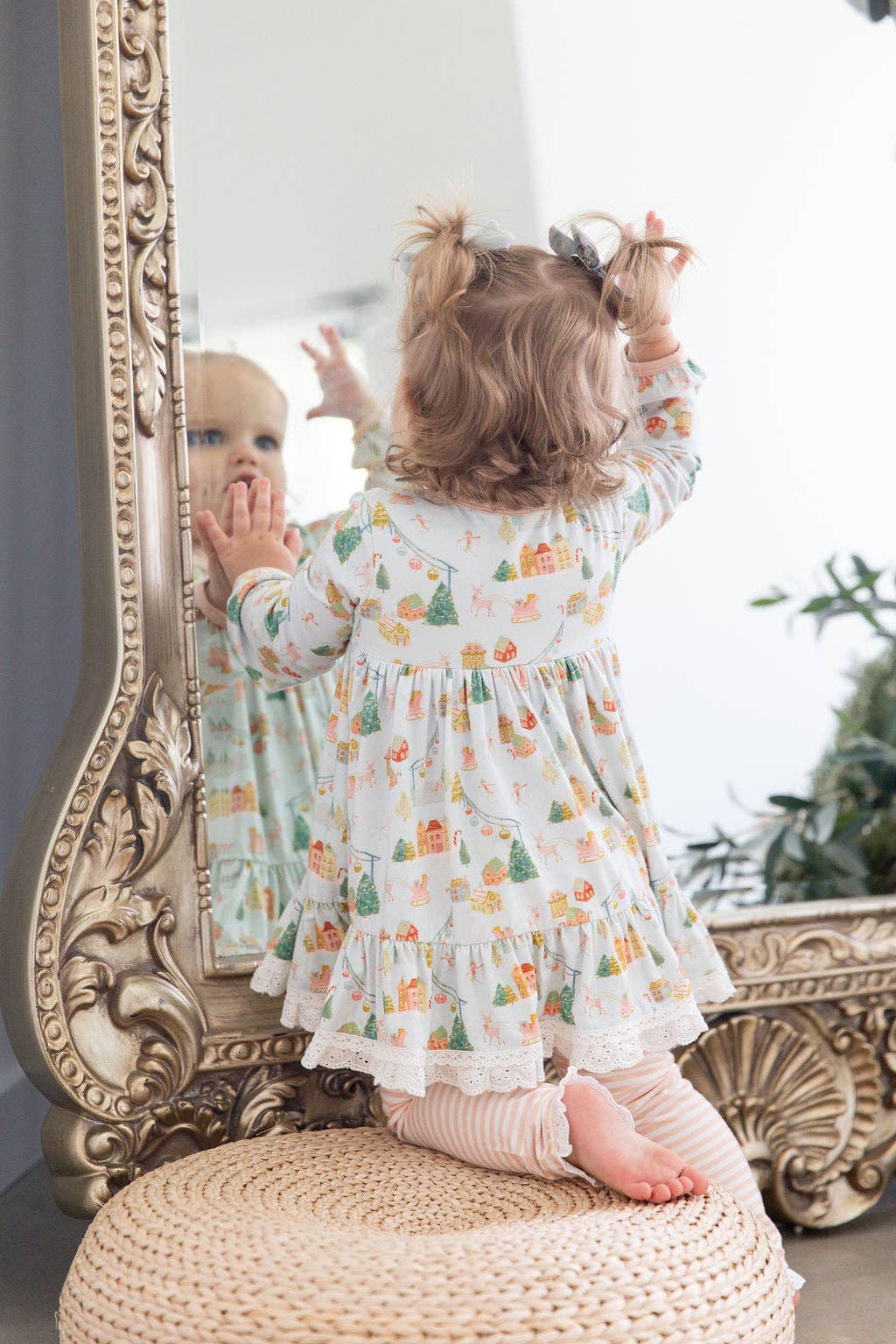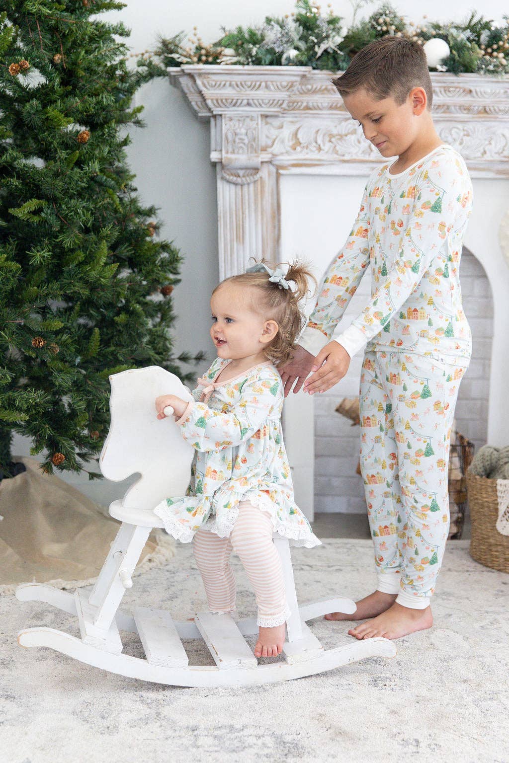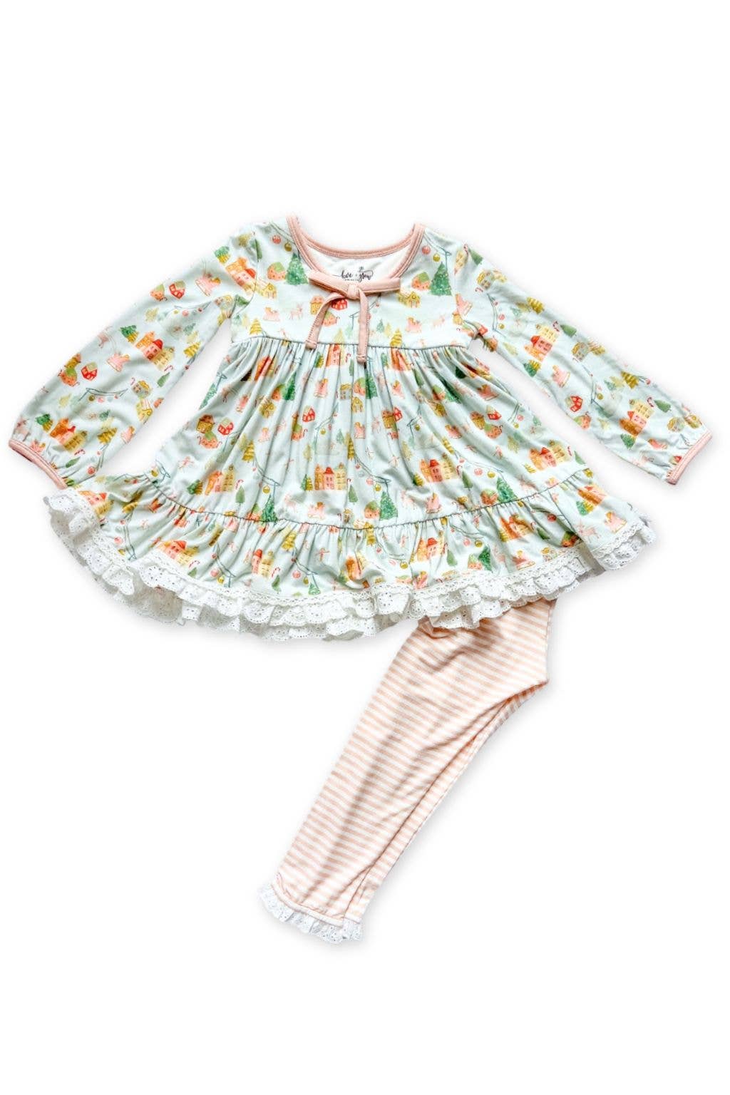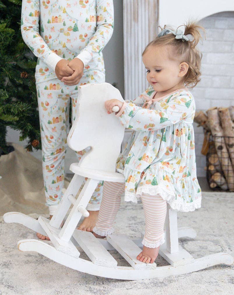 Get your little girl ready for the holidays with our Christmas Village Comfort Set! Featuring a tunic style top and stripe pants, this two piece lounge set will keep her cozy and stylish. Perfect for celebrating and lounging in style this Christmas!