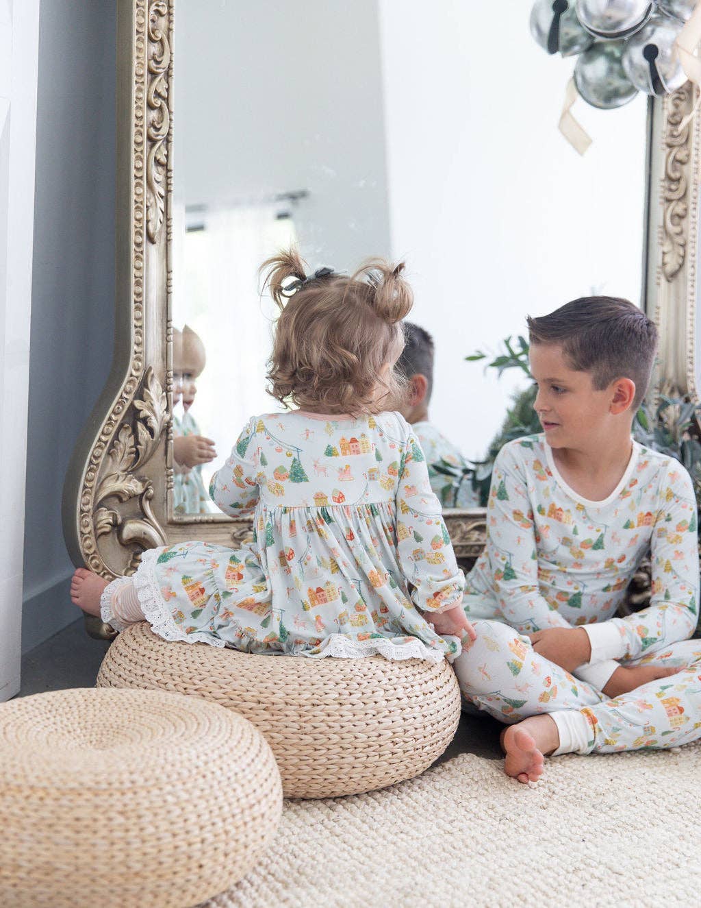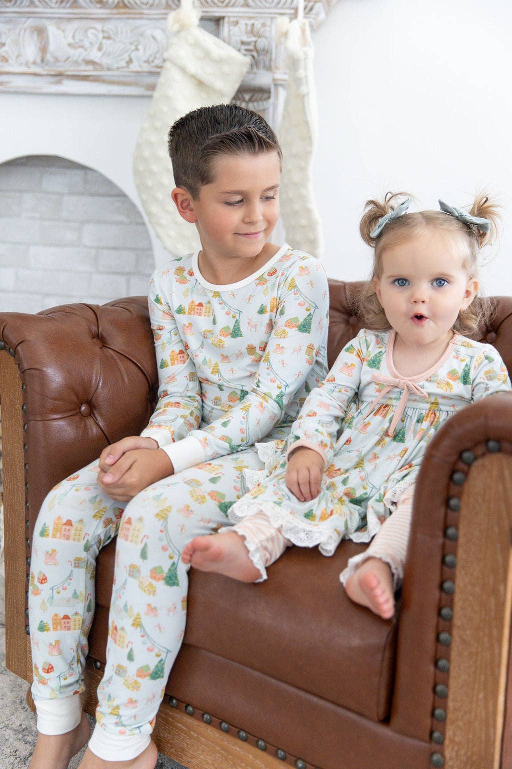 * Set includes long sleeve top and pants in a custom hand-painted Christmas village print