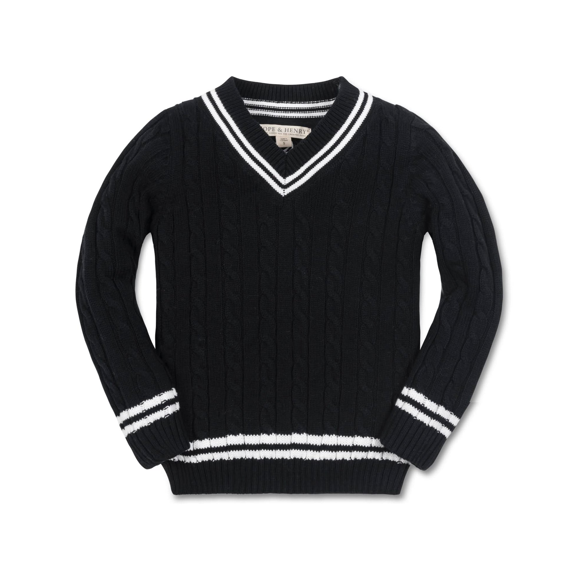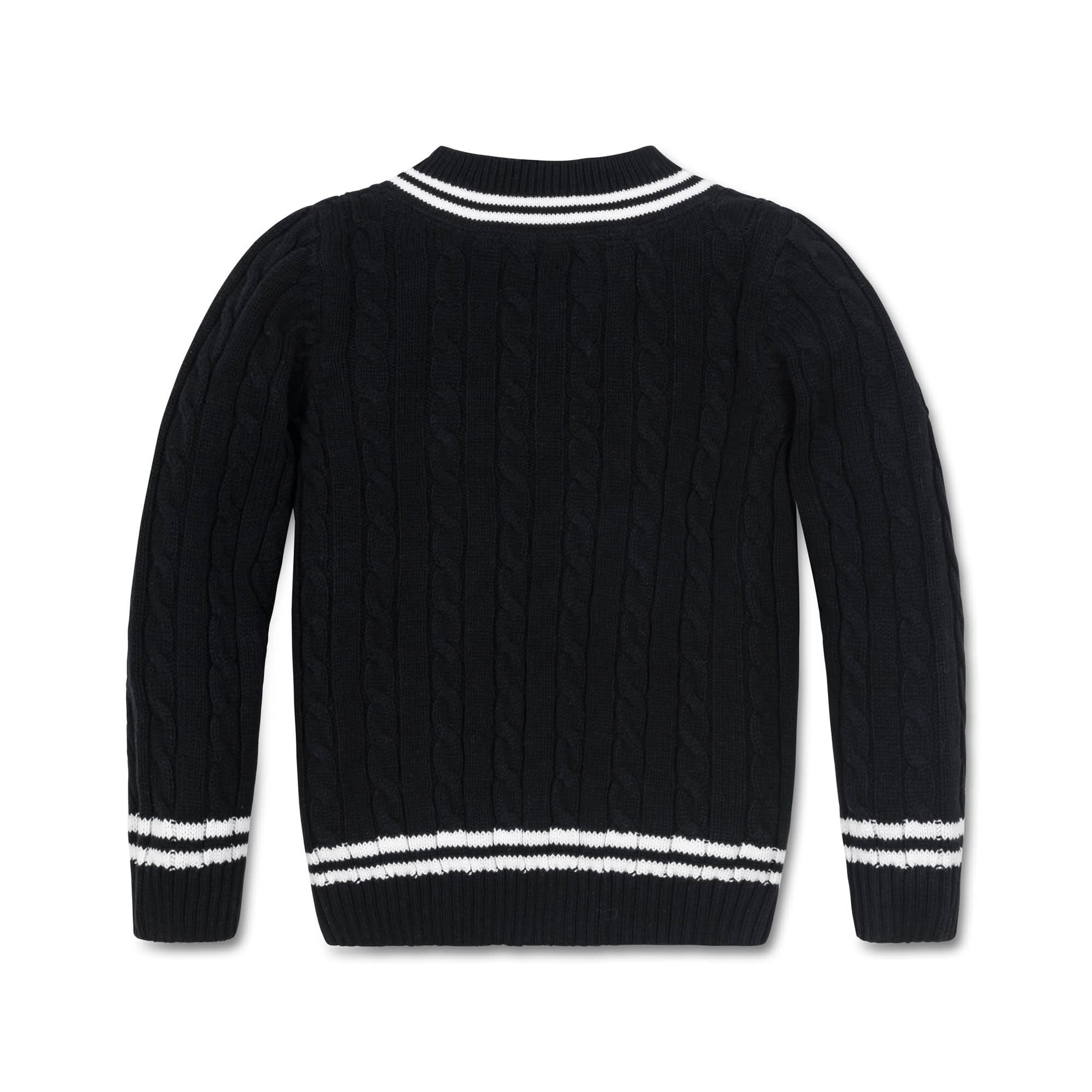 Stay sharp in our preppy cable knit cricket sweater in plush organic cotton. Beautiful cable knit adorns the entire sweater and is trimmed in contrasting stripes at the neck, sleeves and hem. Layers great over our collection of button downs - this is a sweater he'll treasure and pass down for years to come!