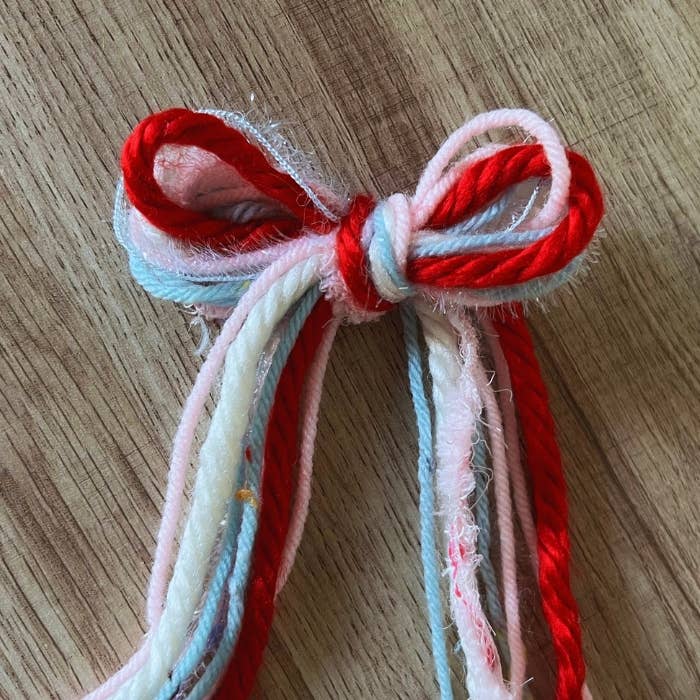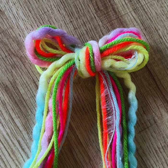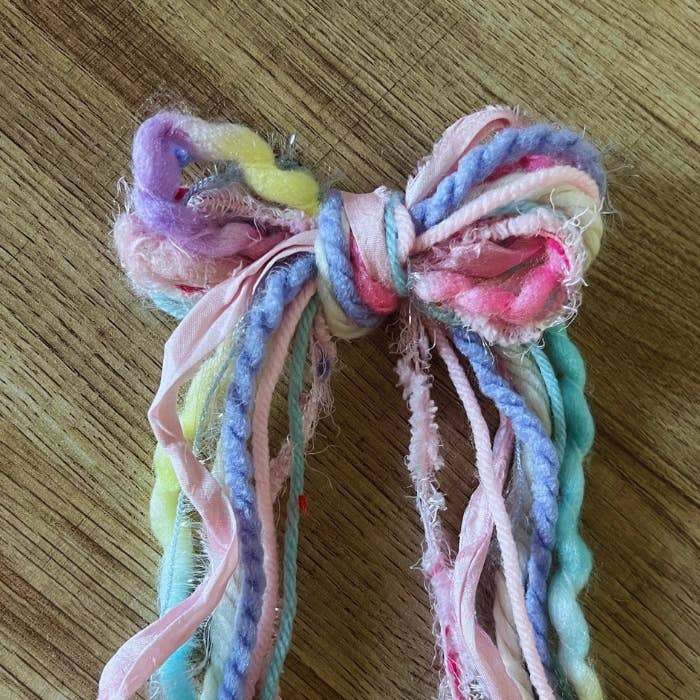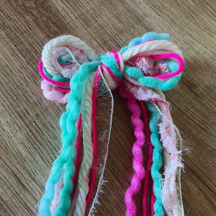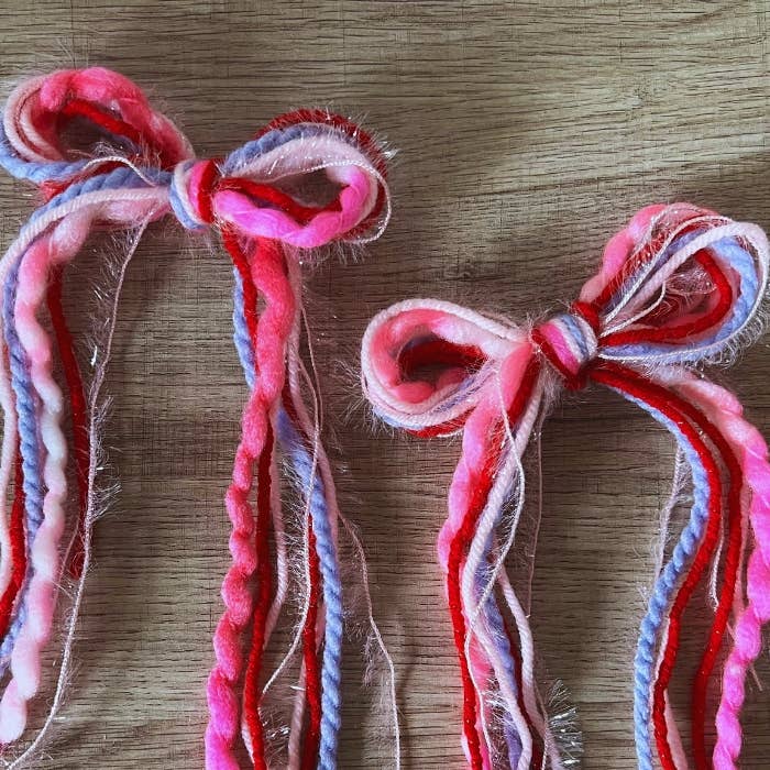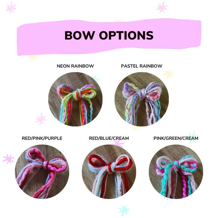 Whimsical yarn hair bows for littles. Each bow is uniquely handmade out of yarn and tinsel in your choice of colors. Bows measure around 3.5" wide x 4" long, and are attached to a small gold alligator hair clip measuring 1.8" wide. Due to the handmade nature, there will be variations in yarn color and size. The bow you receive will be close to, but not exactly as pictured.