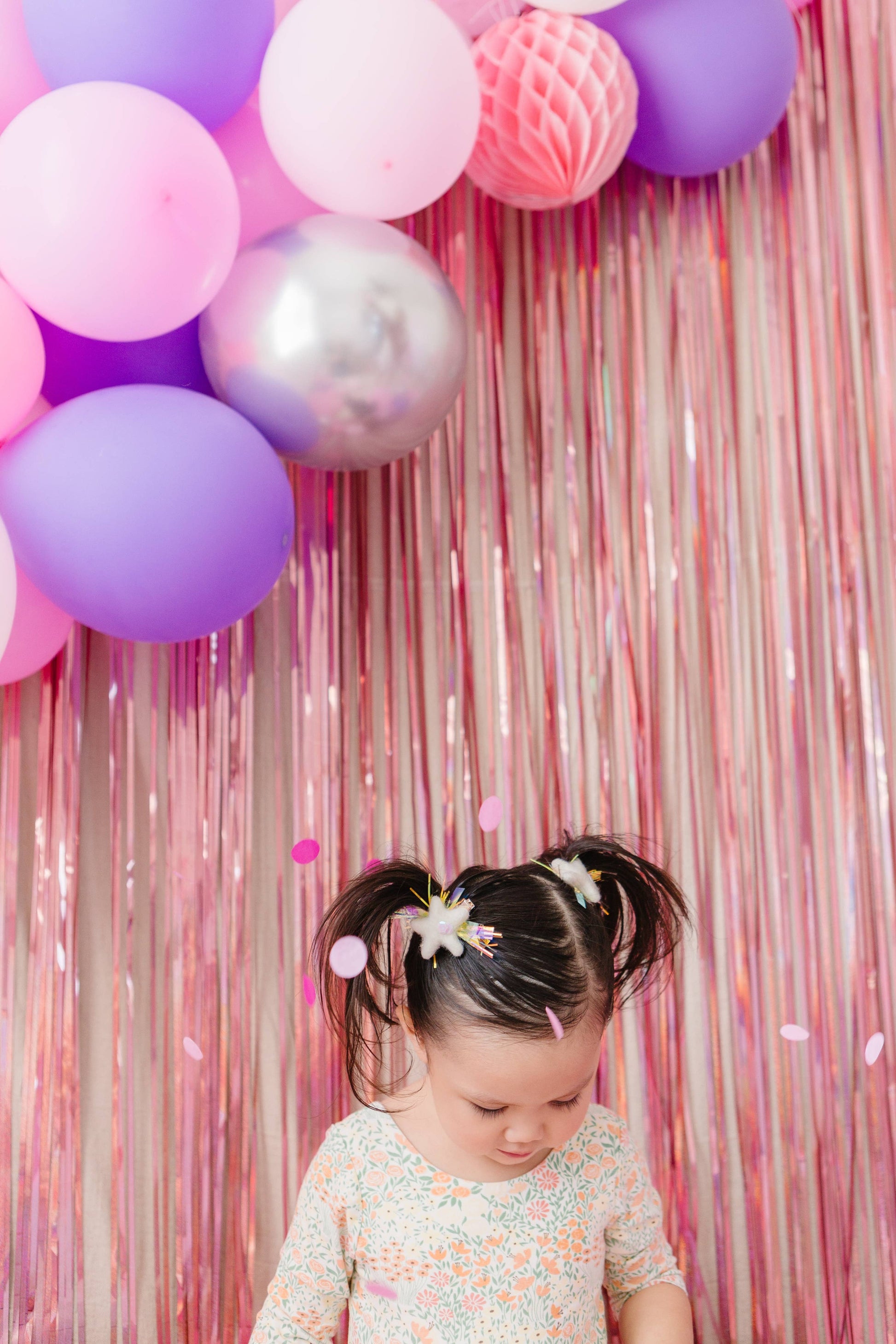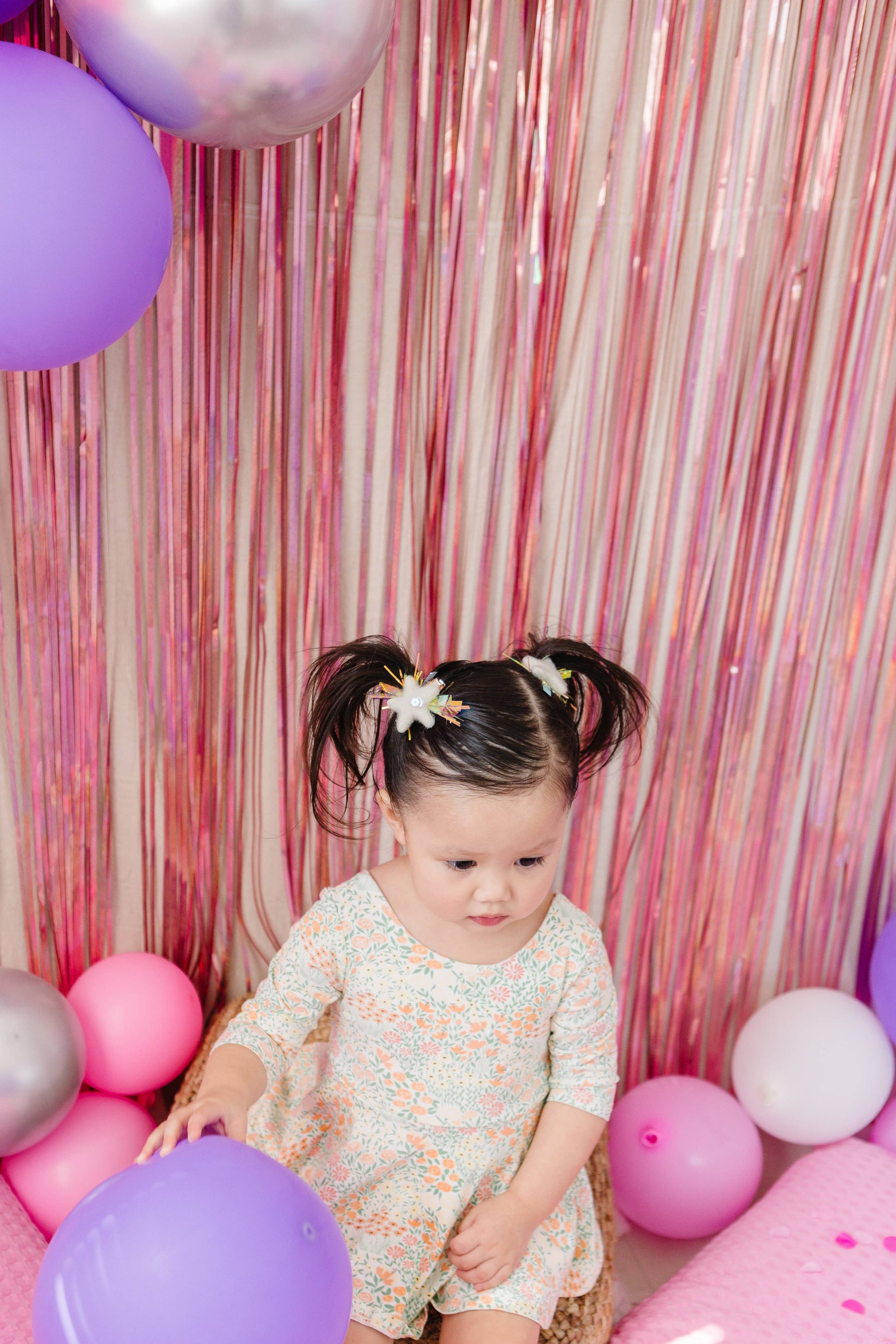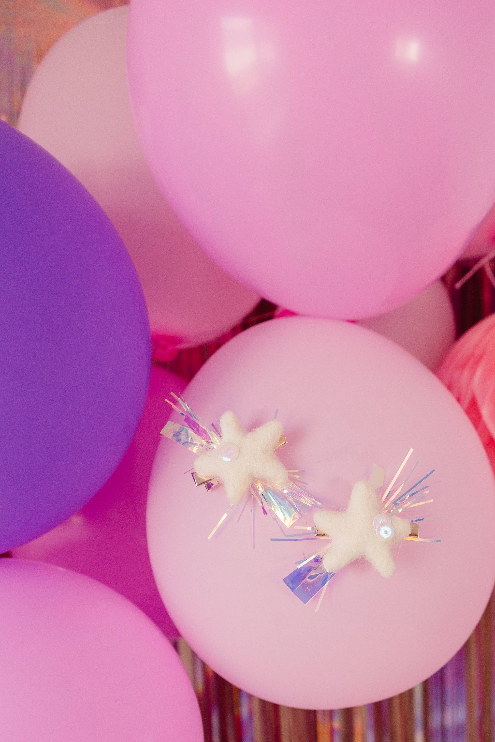 This felt star pigtail set includes two clips. Each clip has sequins and tinsel attached. These felt stars come on rose gold alligator clips.