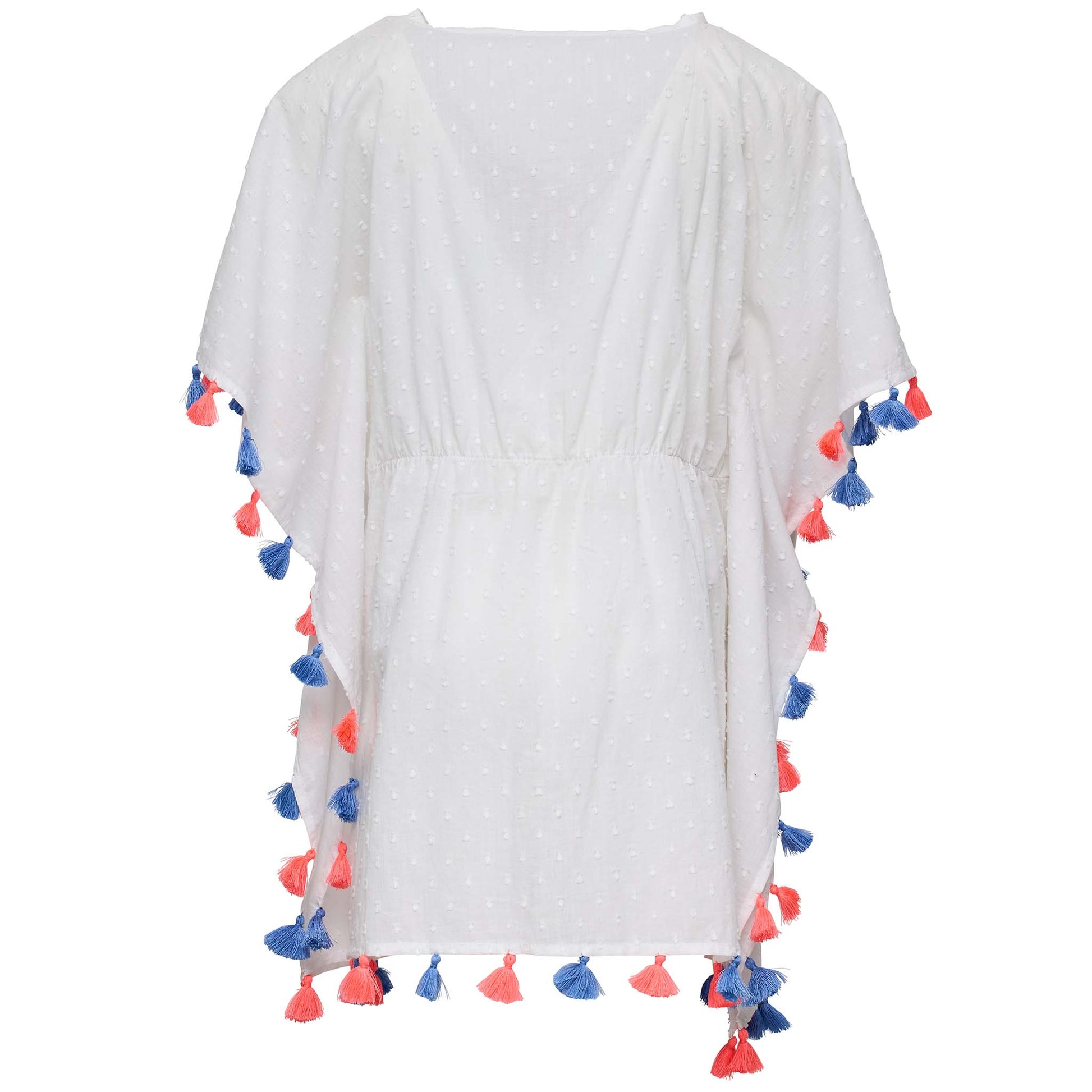 Blend into the beautiful landscape of Santorini in our White Sherbet Tassel Cover Up. The batwing kaftan is made from a white dobby spot fabric with gold, cornflower and coral embroidery and colorful tassels completing this divine look – all for the best summer yet!