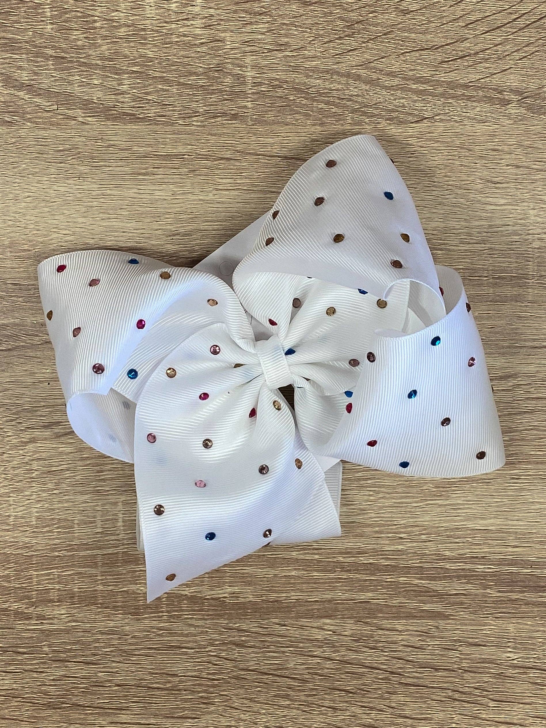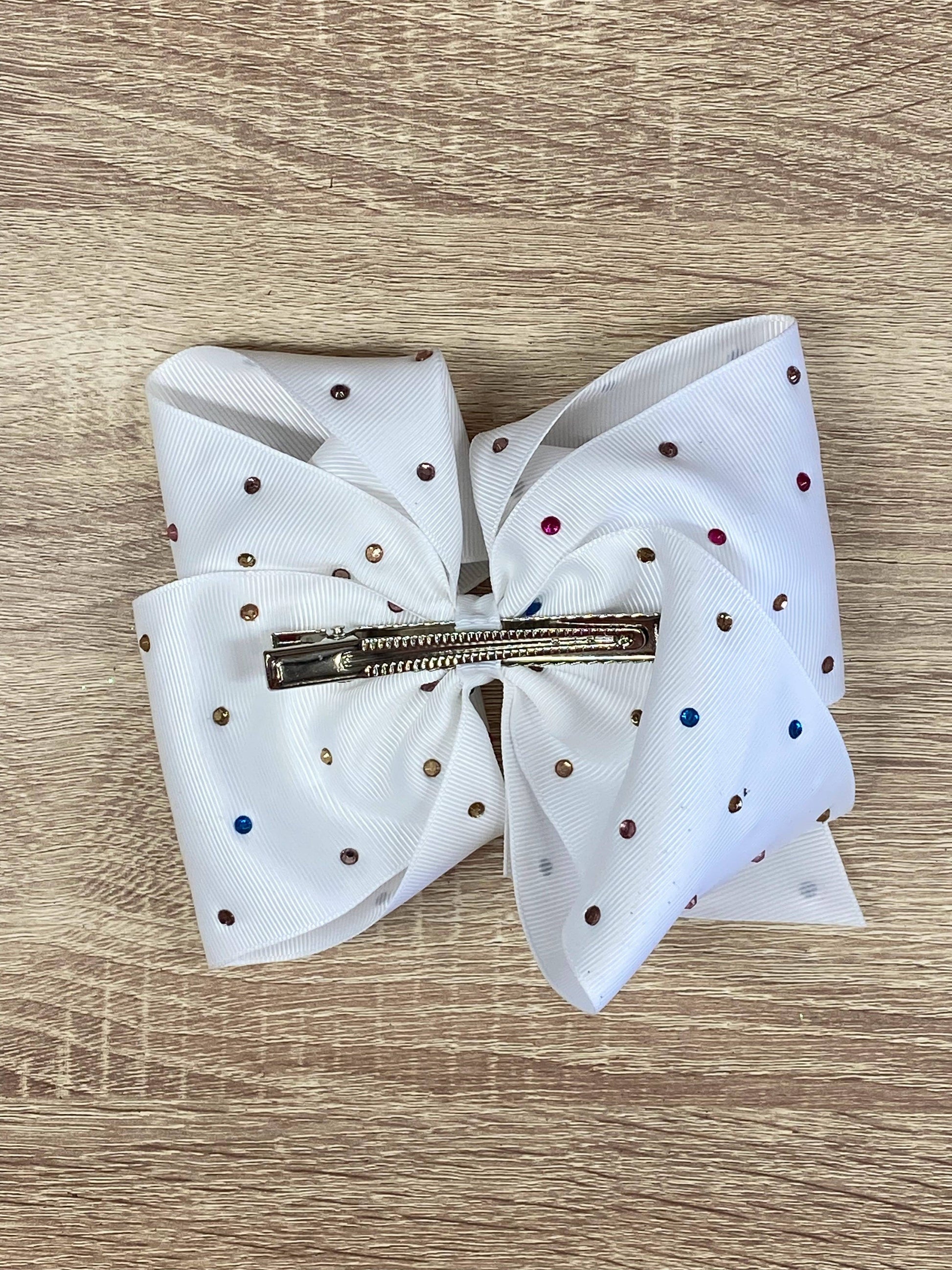 Add a pop of color to your hair with our White with Rainbow Rhinestones Hair Bow! Perfect for adding a touch of playfulness to any outfit or occasion. Sparkling rhinestones in all the colors of the rainbow make this hair bow a must-have accessory!