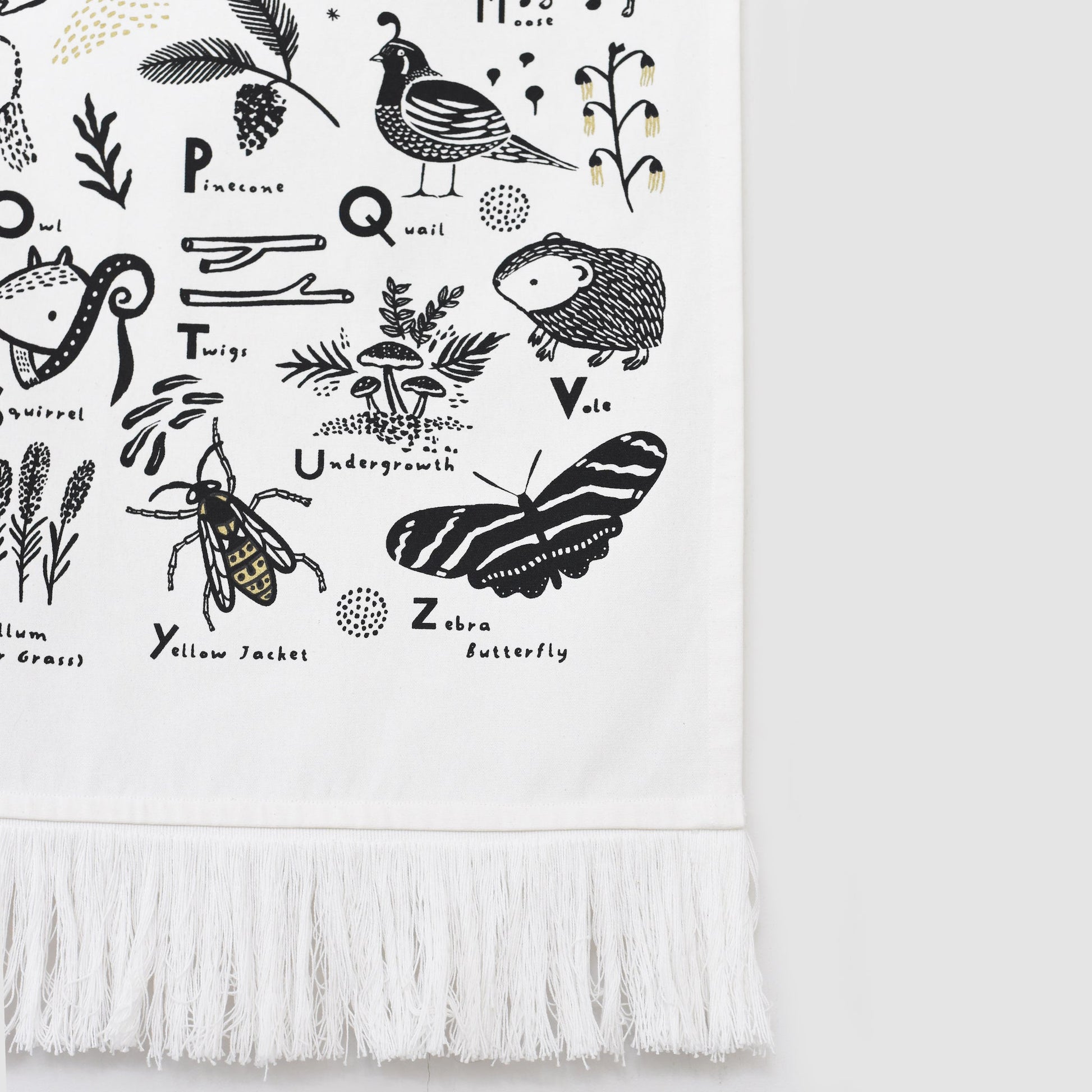 Our illustrated Woodland Alphabet Printed Tapestry made of organic cotton is designed to delight baby with high-contrast details and friendly faces. Ethically and sustainably made in India, this item is a natural addition to your nursery.
